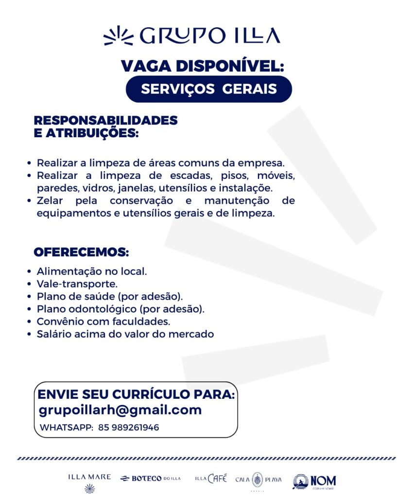 Grupo Illa Abre vagas para Cumim e Auxiliar de Serviços Gerais