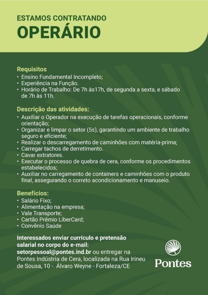 Interessados enviar currículo e pretensão salarial no corpo do e-mail:setorpessoal@pontes.ind.brou entregar na Pontes Indústria de Cera, localizada na Rua Irineu de Sousa, 10 – Álvaro Weyne – Fortaleza/CE.