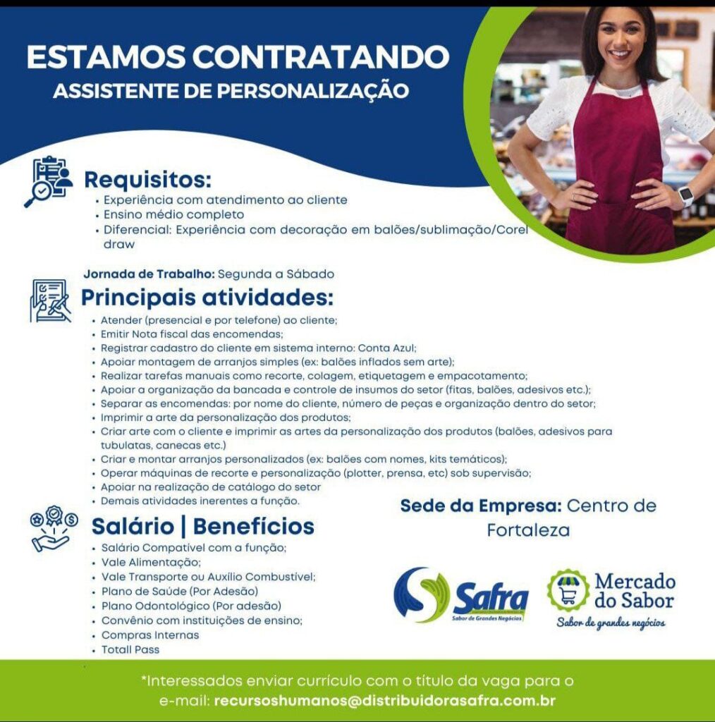 Assistente de Loja, Assistente de Contas a Pagar, Encarregado de Estoque, Assistente de Loja Serviços Gerais, Assistente de Personalização