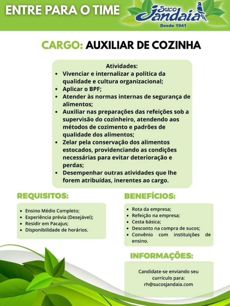Inspetor de Qualidade, Auxiliar de Cozinha, Auxiliar de Produção, Operador de Empilhadeira