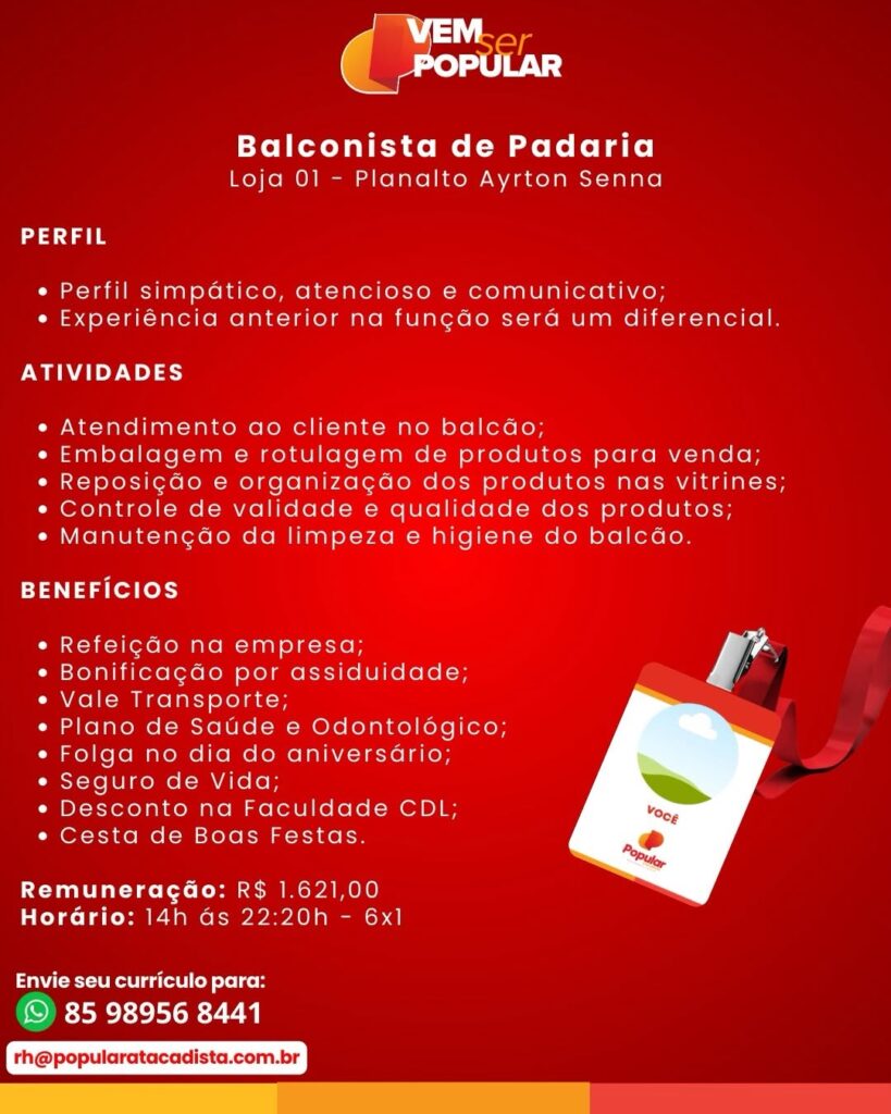 Balconista, Açougueiro, Operador de Empilhadeira, Motorista, Ajudante de Rota, Encarregado de Prevenção de Perdas