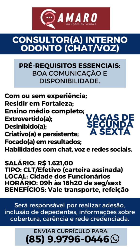 Enviar currículo atualizado em PDF para: (85) 2138-8955Necessário ter experiência com vendas de serviços ou presencial.