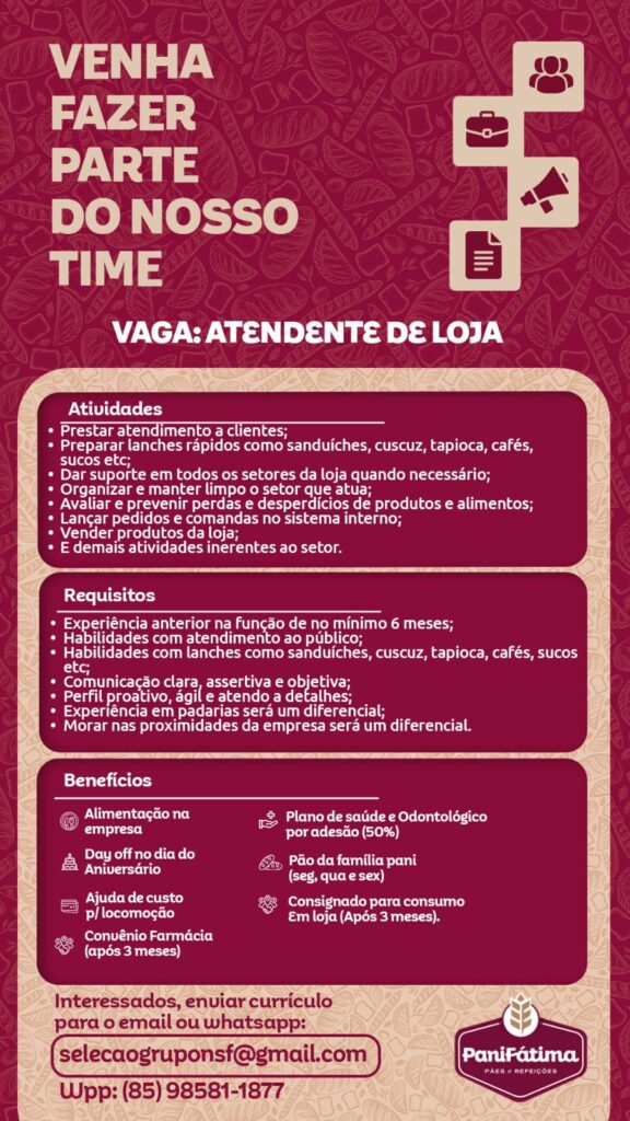 ENVIE SEU CURRÍCULO PARA:Contato: (85) 98621-1077E-mail: vagastake@gmail.comTAKE A JUICE