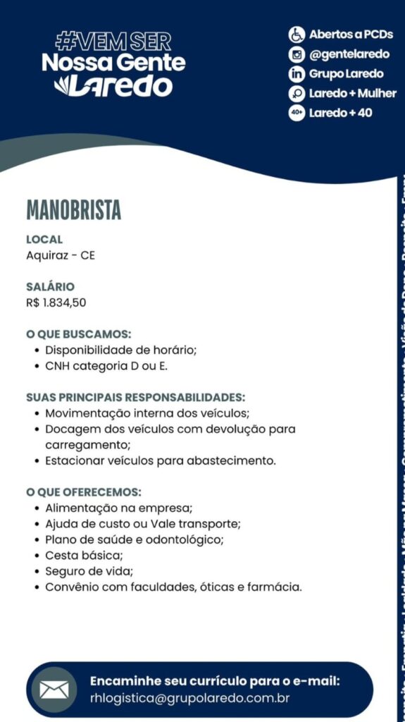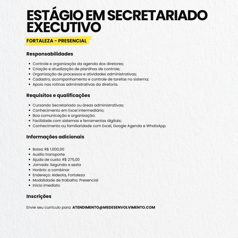 Estágio em Logística, Auxiliar de Contas a Receber, Analista de Controladoria, Assistente Comercial, Assistente de Recursos Humanos, Analista de Gente e Gestão, Estágio em Vendas, Assistente de Engenharia, Supervisor(a) de Serviços Gerais, Assistente de Logística, Estágio em Secretariado, Engenheiro(a) de Obra