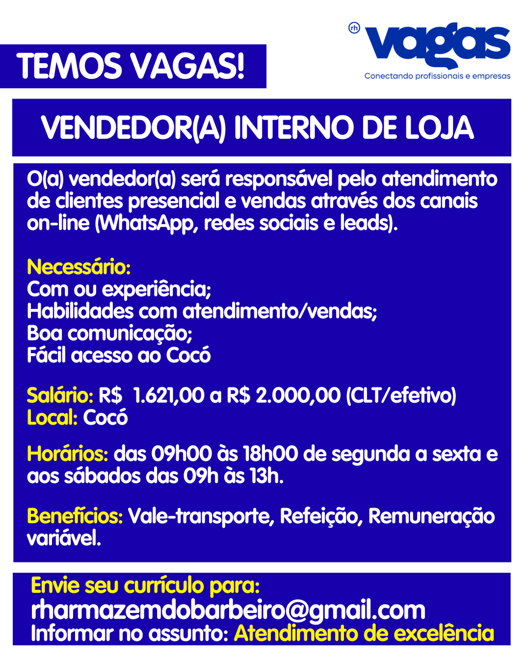 Não nos responsabilizamos pelas vagas, nem pelas informações fornecidas referente as mesmas, também não nos responsabilizamos pela idoneidade das empresas e instituições, apenas divulgamos as vagas que recebemos. Alertamos à buscar informações sobre as empresas que estão disponibilizando as vagas, através de contato por telefone ou e-mail divulgados nas mesmas, além de pesquisar na internet ou outros meios. Tome muito cuidado com locais (empresas ou instituições) que cobram taxas para garantir vagas ou para garantir uma colocação no mercado de trabalho. Esteja atento (a) a localização (endereço) da entrevista e do local de trabalho, se não conhecer ou achar que é um lugar isolado, vá com uma companhia ou não vá. Ter um emprego para garantir seu sustento e de sua família é importante, mas sua segurança e integridade também é, por isso, esteja atento. Se você é menor de idade vá acompanhado (a) de um (a) responsável.