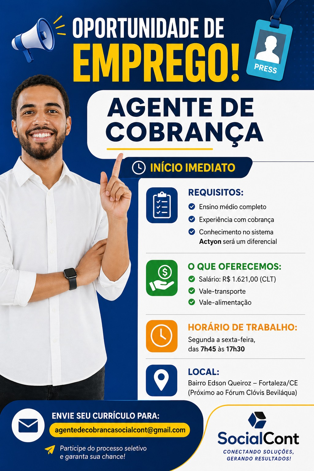 Envie seu currículo para: agentedecobrancasocialcont@gmail.com