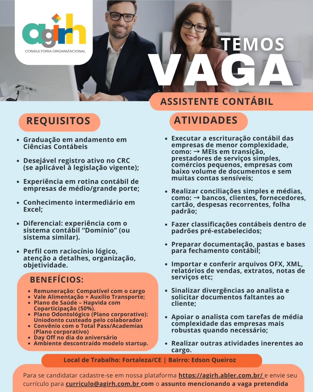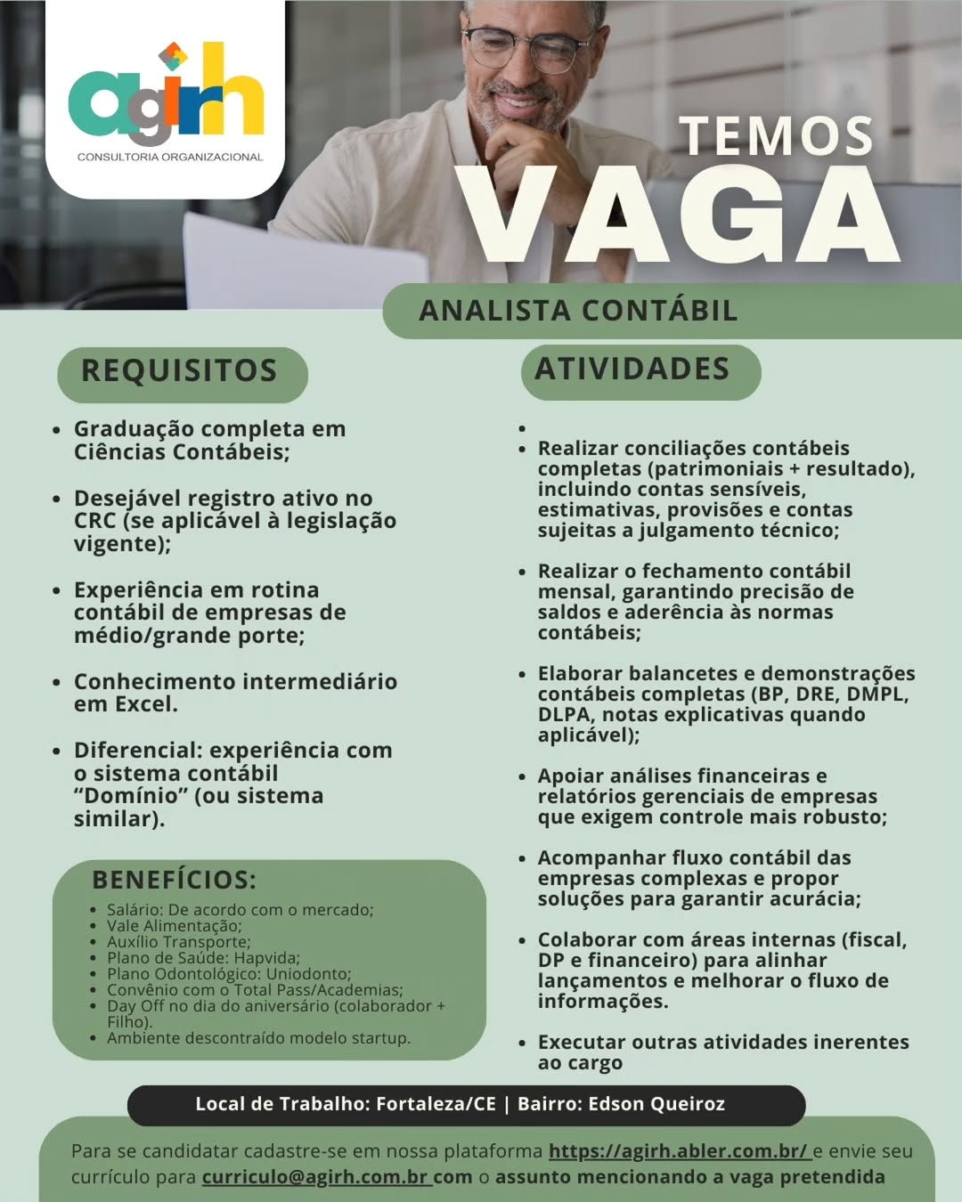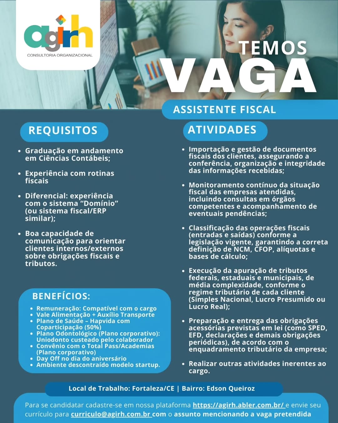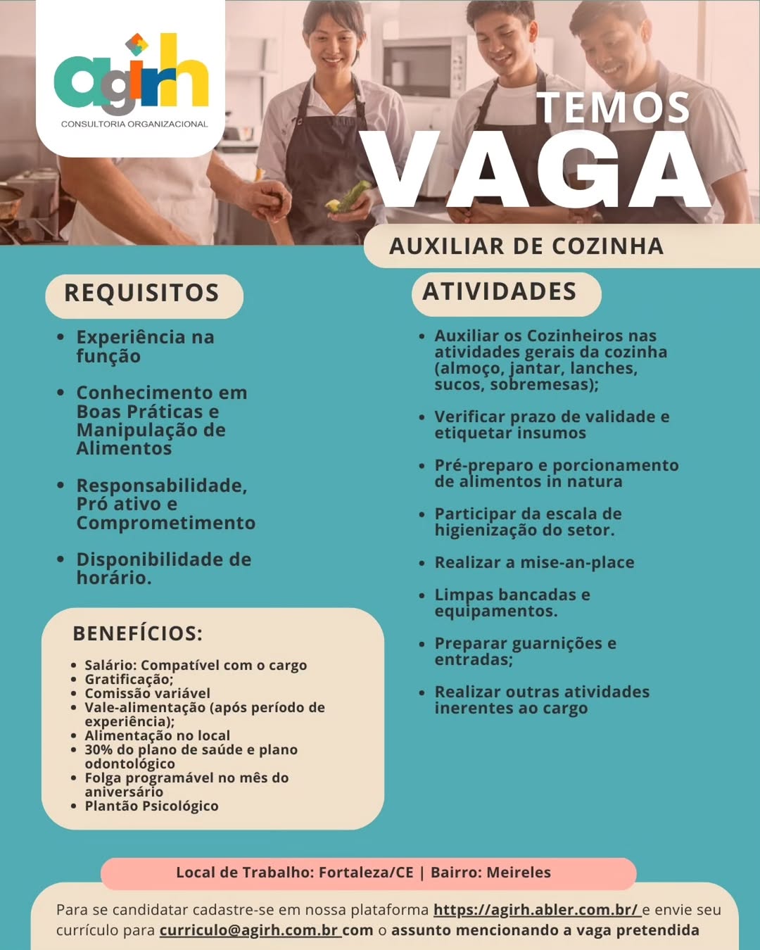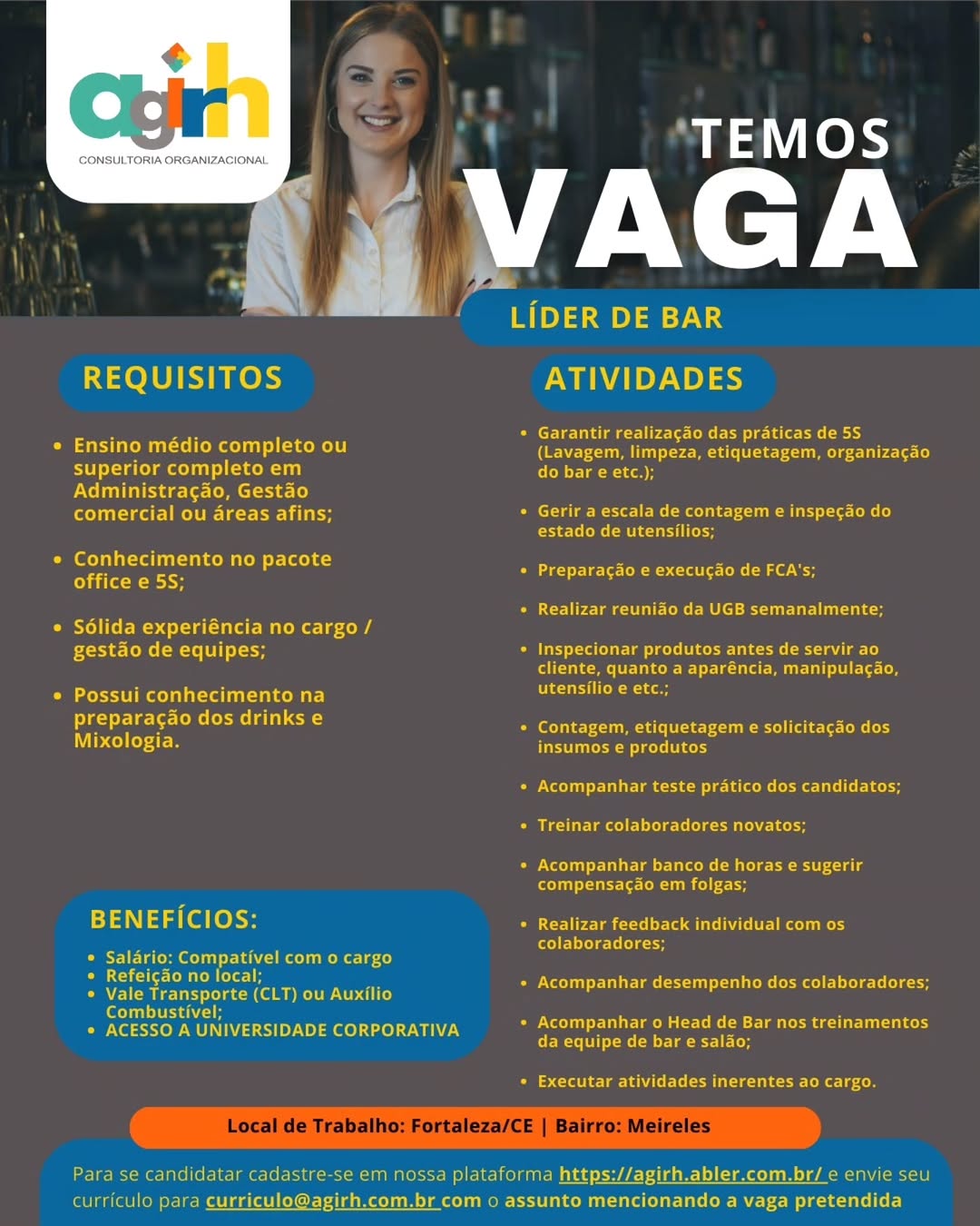 Analista Fiscal, Auxiliar de Serviços Gerais, Assistente Administrativo, Assistente Fiscal, Auxiliar de Cozinha, Líder de Bar, Analista Contábil, Assistente Contábil