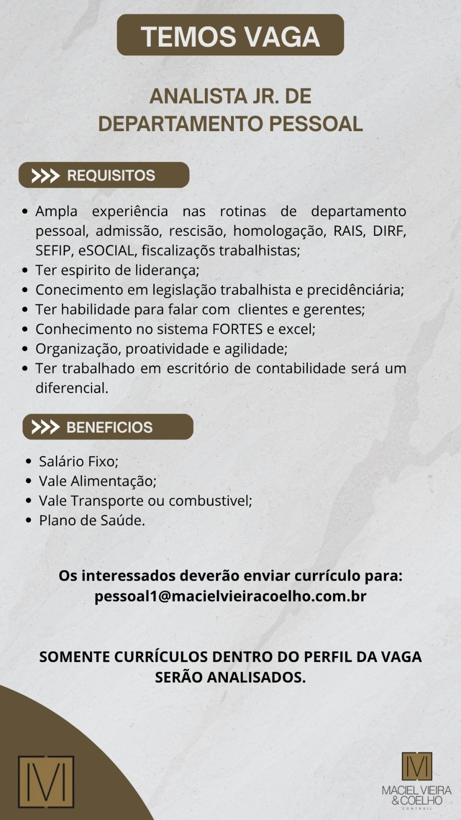 Enviar currículo para: pessoal1@macielvieiracoelho.com.br