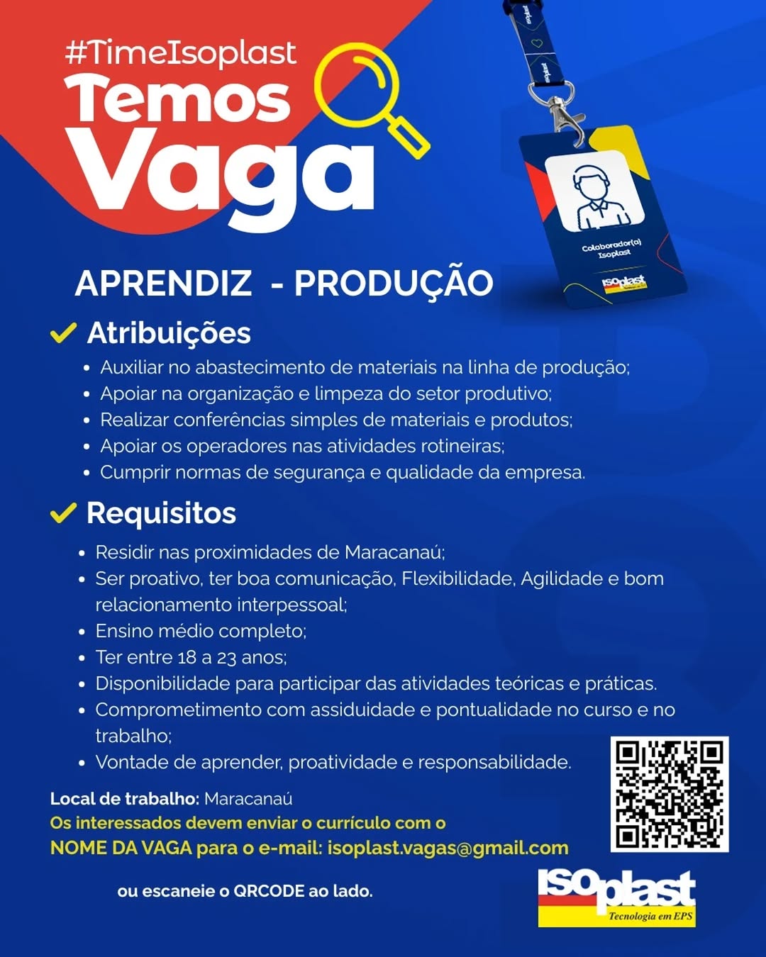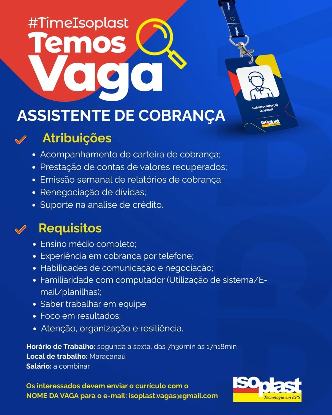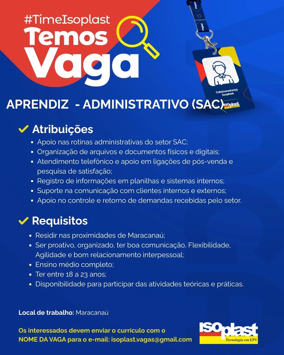 Nós não somos agência de empregos, não cobramos nada, nem antes e nem depois de você conseguir o seu emprego. Não somos nós que realizamos a seleção de currículos, também não realizamos entrevistas. Não nos responsabilizamos pelo envio de currículos. O envio de currículo deverá ser realizado pela pessoa interessada no e-mail que estiver na vaga.