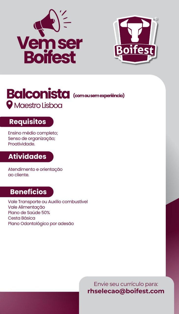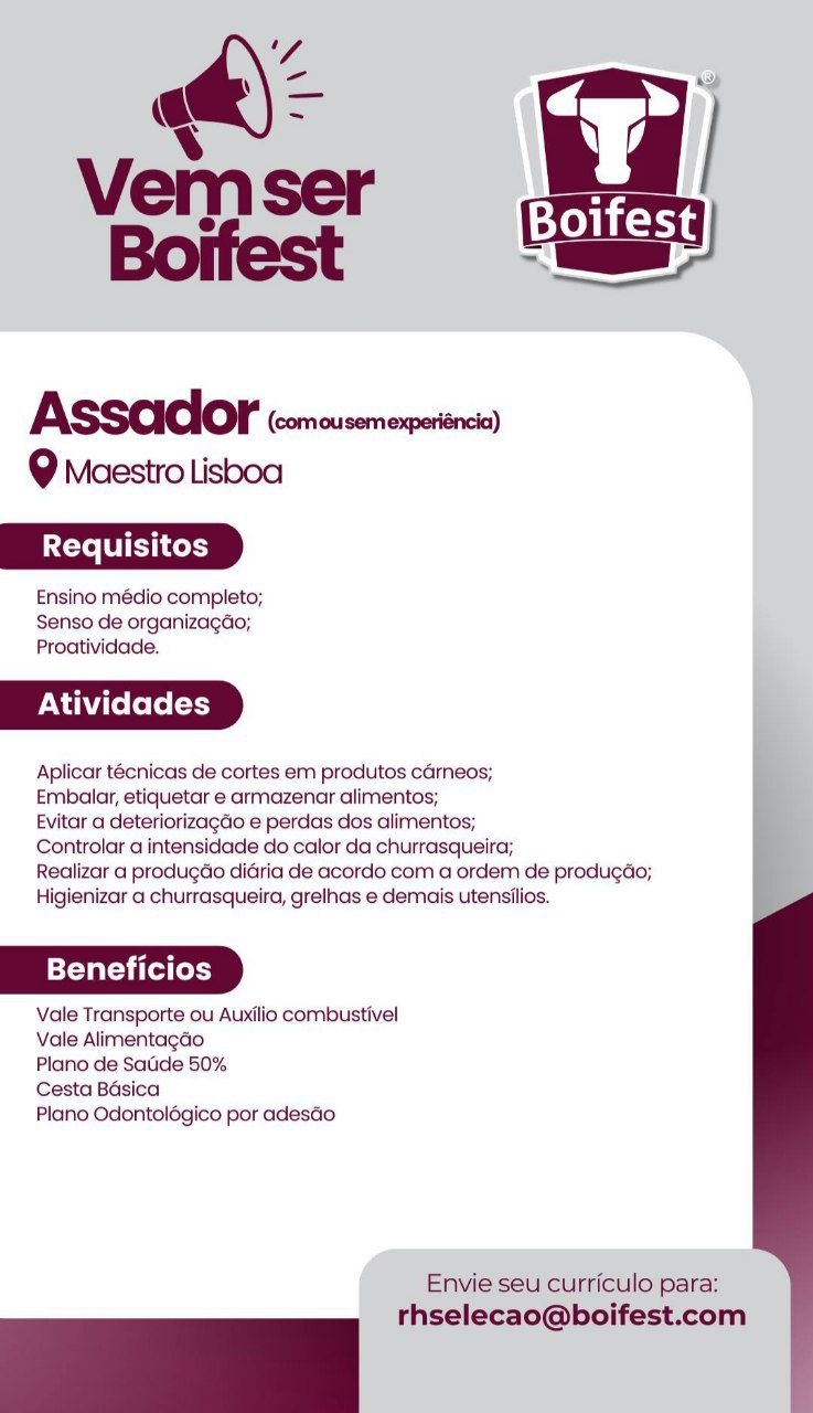 As vagas são divulgadas da mesma forma que recebemos. Não nos responsabilizamos pelas vagas, nem pelas informações fornecidas referente as mesmas, também não nos responsabilizamos pela idoneidade das empresas e instituições, apenas divulgamos as vagas que recebemos. Alertamos à buscar informações sobre as empresas que estão disponibilizando as vagas, através de contato por telefone ou e-mail divulgados nas mesmas, além de pesquisar na internet ou outros meios. Tome muito cuidado com locais (empresas ou instituições) que cobram taxas para garantir vagas ou para garantir uma colocação no mercado de trabalho. Esteja atento (a) a localização (endereço) da entrevista e do local de trabalho, se não conhecer ou achar que é um lugar isolado, vá com uma companhia ou não vá. Ter um emprego para garantir seu sustento e de sua família é importante, mas sua segurança e integridade também é, por isso, esteja atento. Se você é menor de idade vá acompanhado (a) de um (a) responsável.
