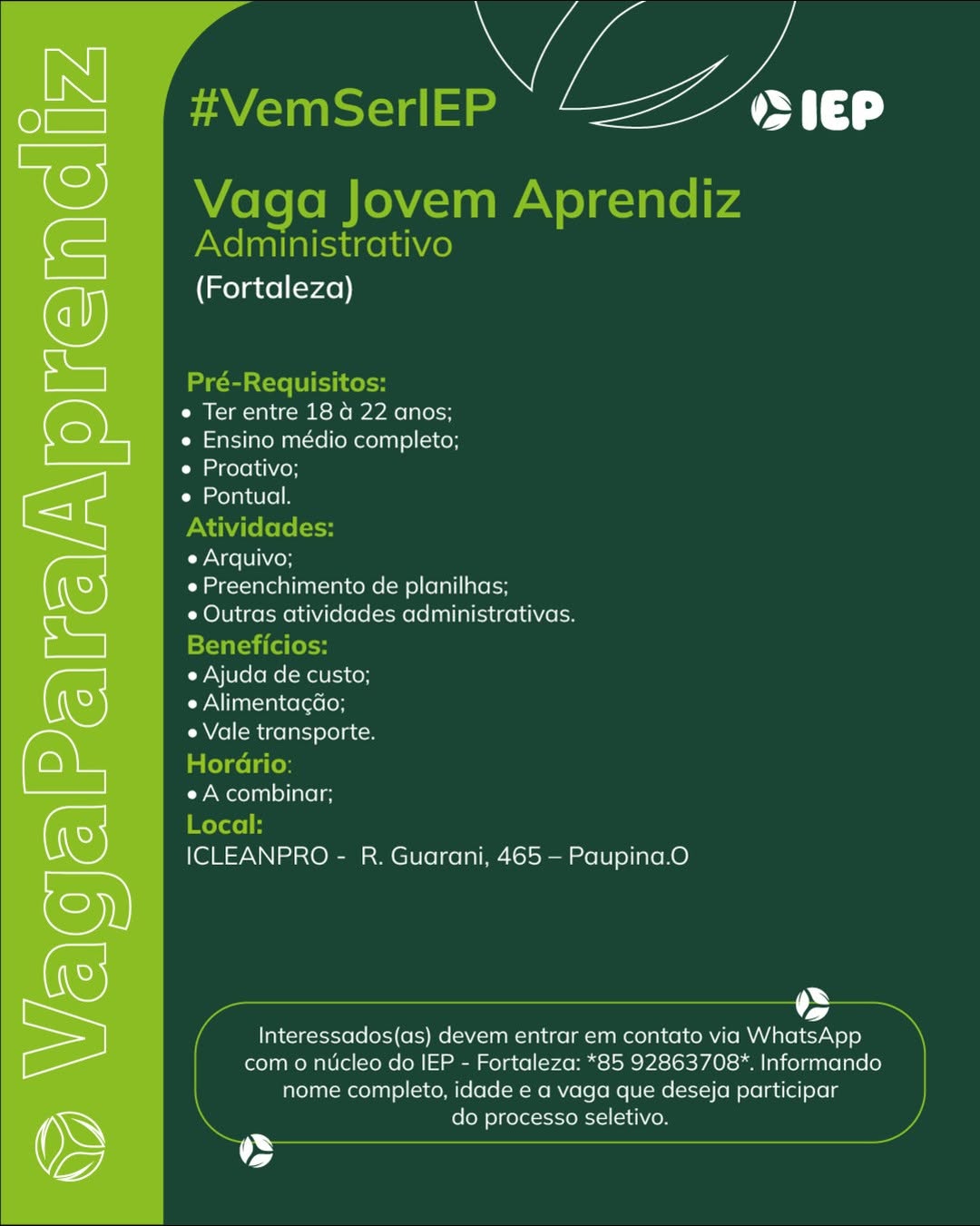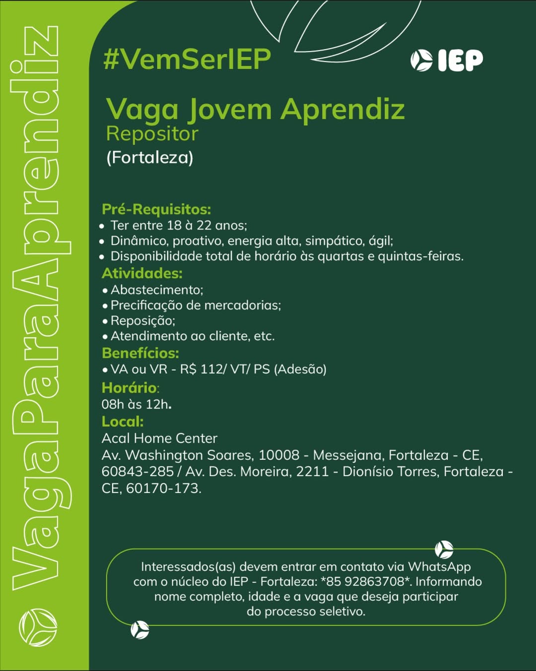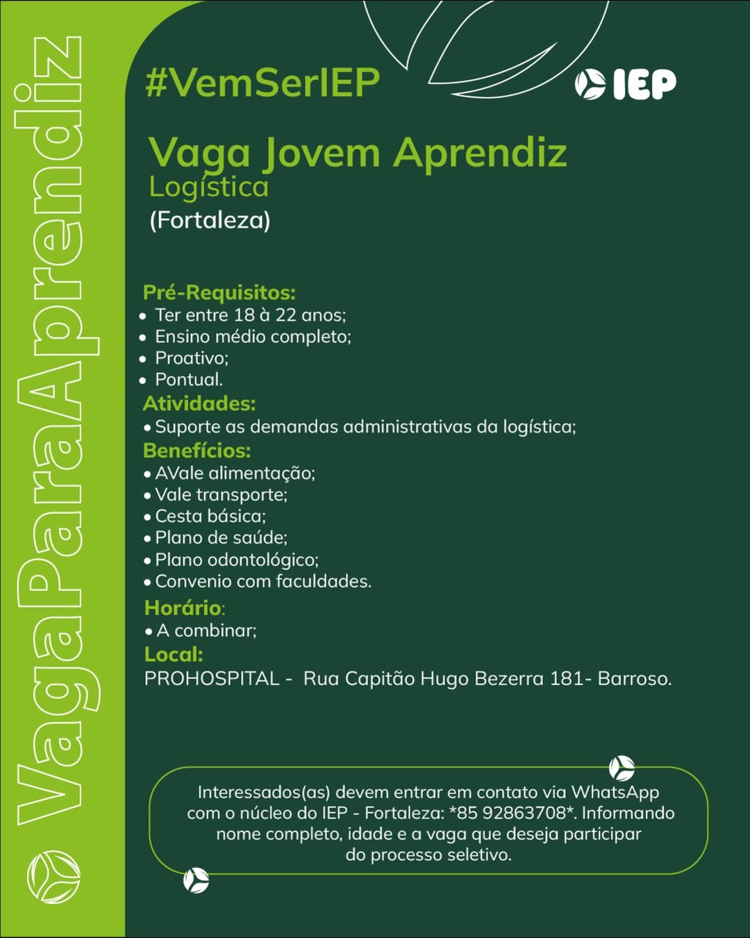 Assistente Administrativo, Jovem Aprendiz Repositor, Jovem Aprendiz Recepção, Jovem Aprendiz Logística, Jovem Aprendiz Administrativo, Estágio