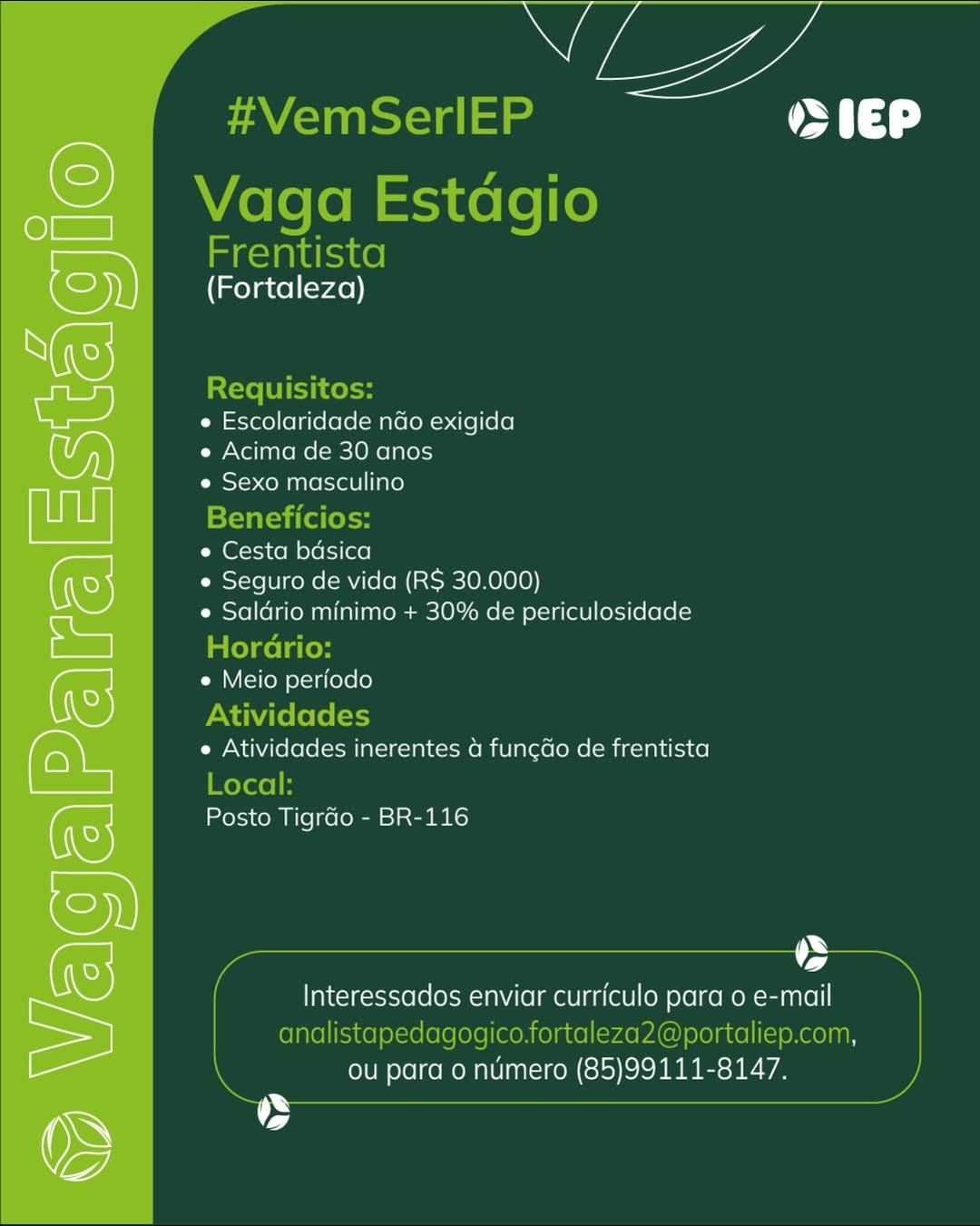 As vagas são divulgadas da mesma forma que recebemos. Não nos responsabilizamos pelas vagas, nem pelas informações fornecidas referente as mesmas, também não nos responsabilizamos pela idoneidade das empresas e instituições, apenas divulgamos as vagas que recebemos. Alertamos à buscar informações sobre as empresas que estão disponibilizando as vagas, através de contato por telefone ou e-mail divulgados nas mesmas, além de pesquisar na internet ou outros meios. Tome muito cuidado com locais (empresas ou instituições) que cobram taxas para garantir vagas ou para garantir uma colocação no mercado de trabalho. Esteja atento (a) a localização (endereço) da entrevista e do local de trabalho, se não conhecer ou achar que é um lugar isolado, vá com uma companhia ou não vá. Ter um emprego para garantir seu sustento e de sua família é importante, mas sua segurança e integridade também é, por isso, esteja atento. Se você é menor de idade vá acompanhado (a) de um (a) responsável.