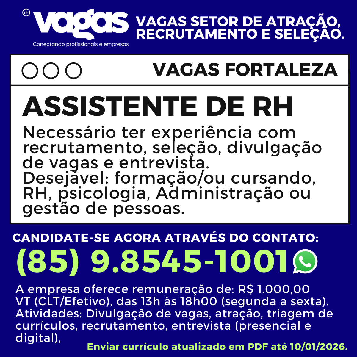 Necessário ter experiência com recrutamento, seleção, divulgação de vagas e entrevista.