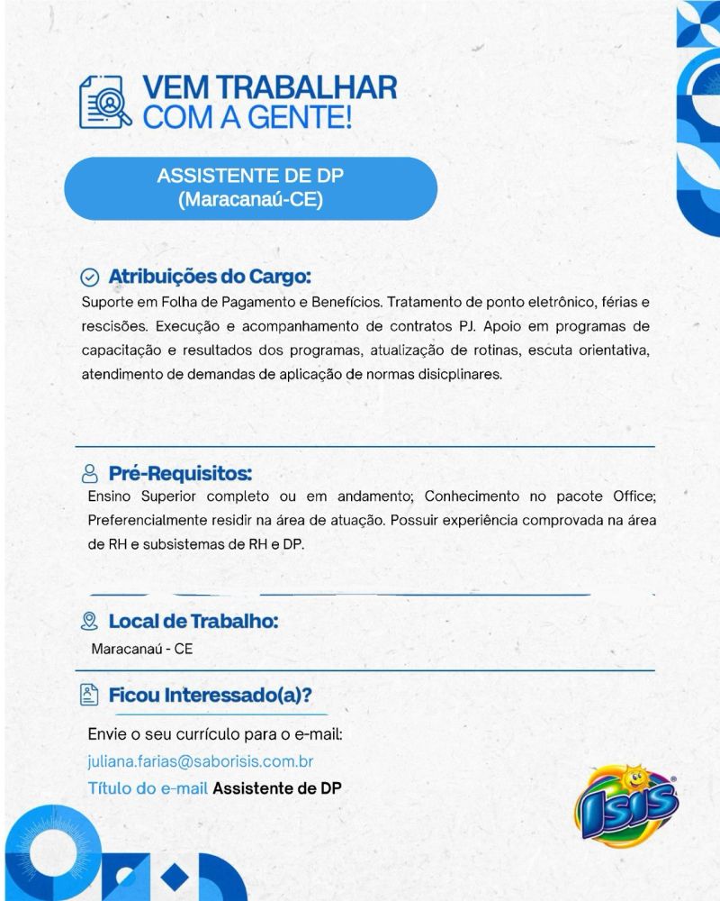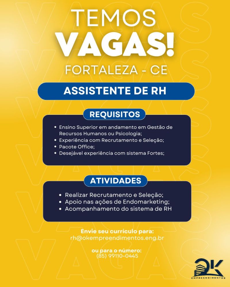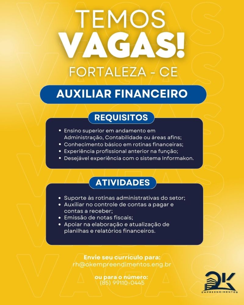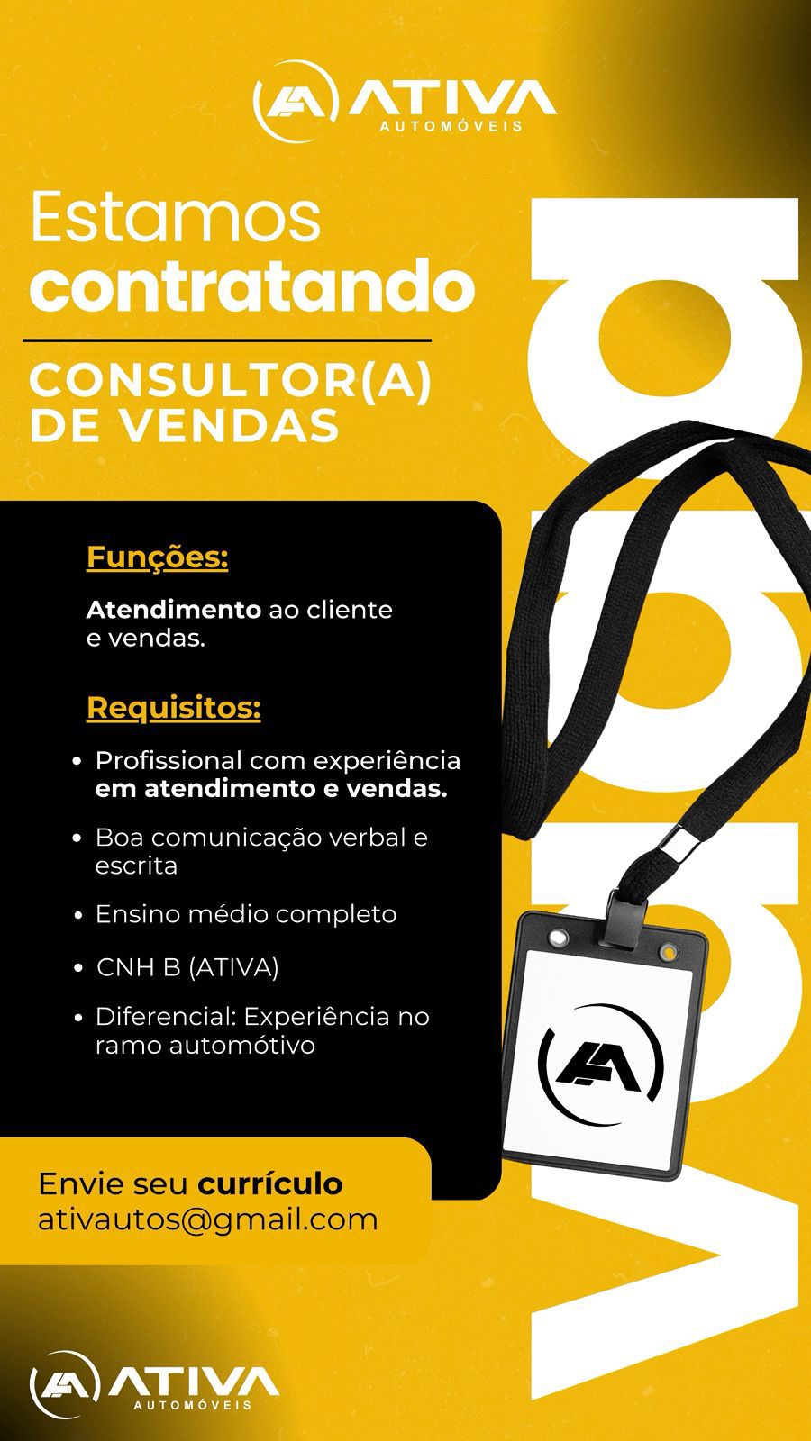 Assistente de RH, Auxiliar de Frota, Motorista, Orientador Educacional, Assistente de Departamento Pessoal, Assistente de TI, Auxiliar Financeiro, Supervisor de Engenharia, Consultor(a) de Vendas