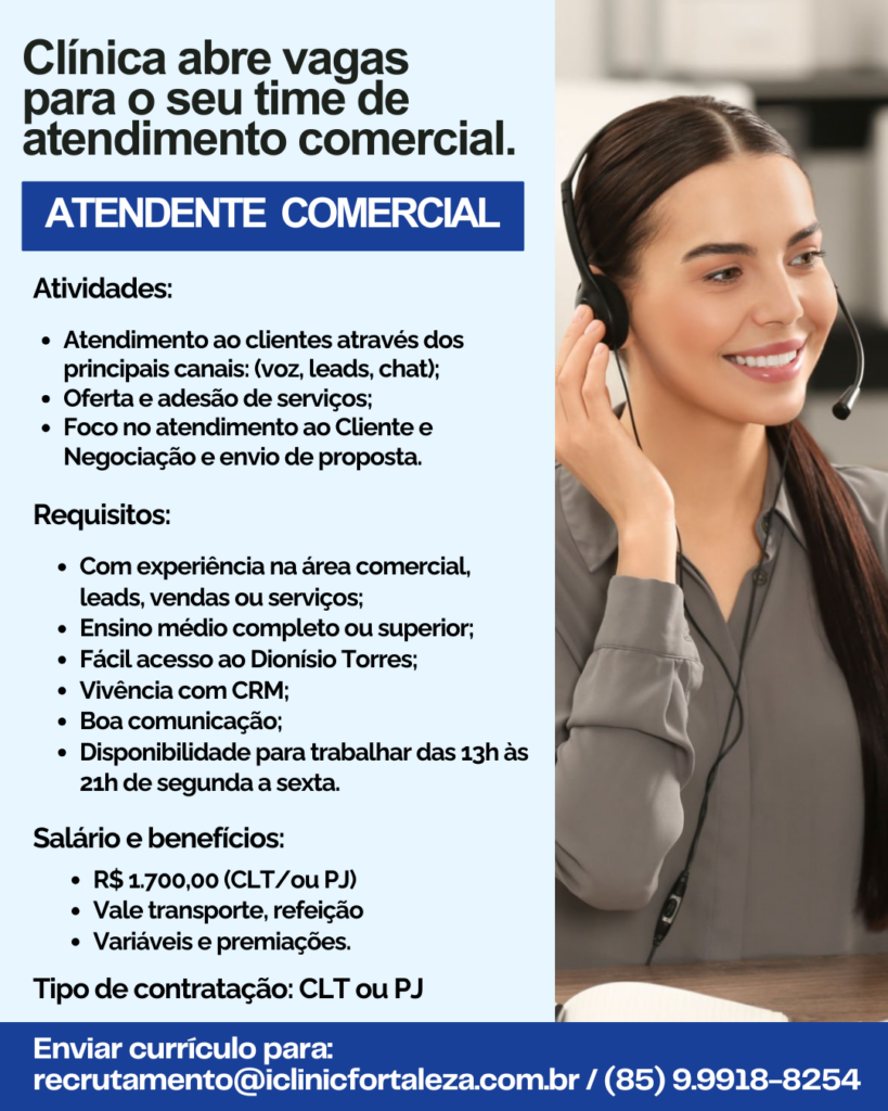 Enviar currículo para: recrutamento@iclinicfortaleza.com.br ou através do contato de WhatsApp (85) 9.9918-8254