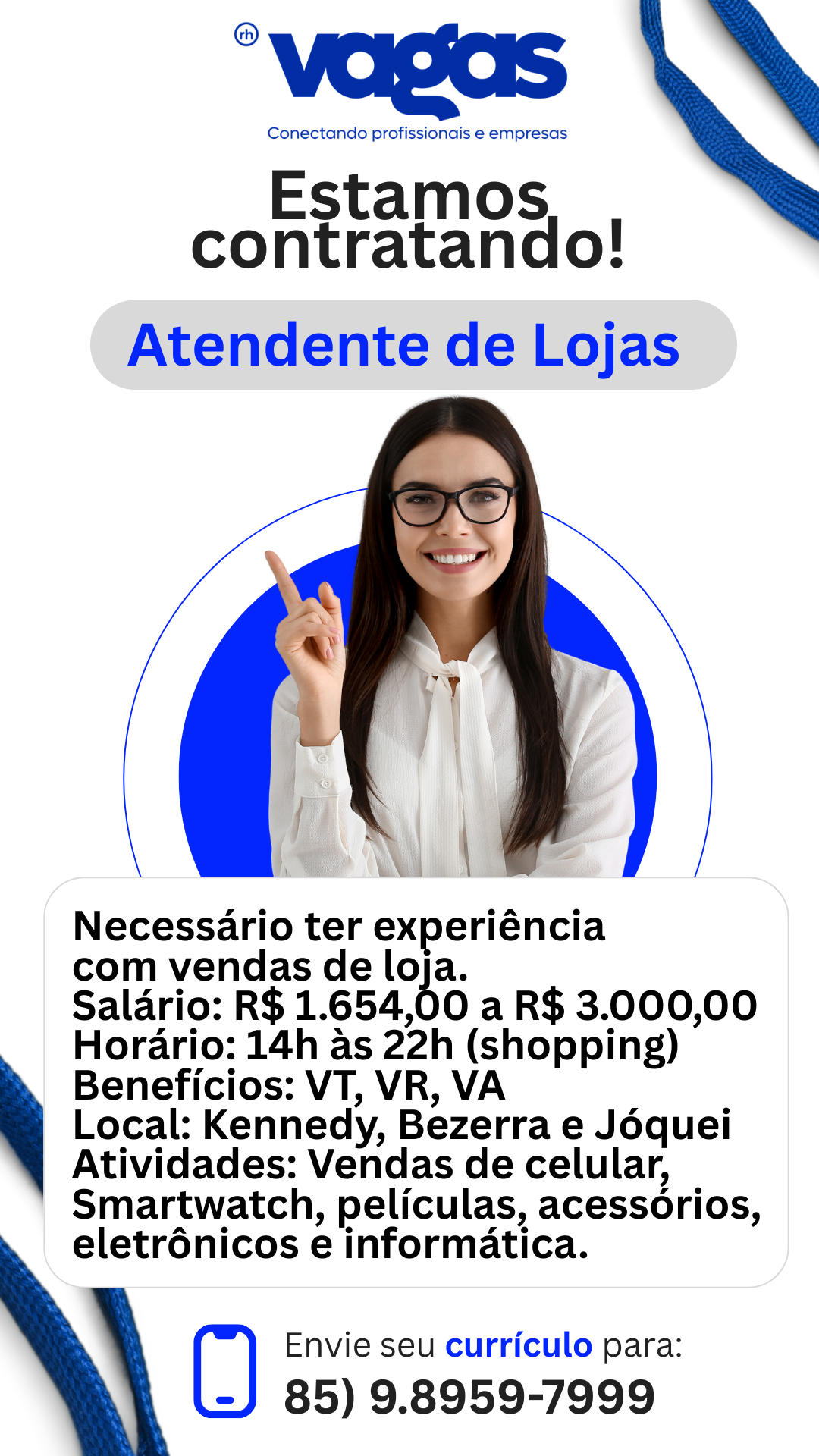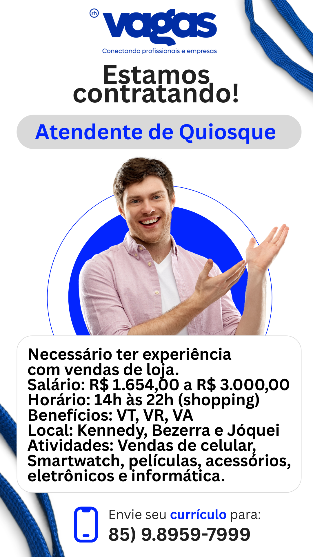 As vagas são divulgadas da mesma forma que recebemos. Não nos responsabilizamos pelas vagas, nem pelas informações fornecidas referente as mesmas, também não nos responsabilizamos pela idoneidade das empresas e instituições, apenas divulgamos as vagas que recebemos. Alertamos à buscar informações sobre as empresas que estão disponibilizando as vagas, através de contato por telefone ou e-mail divulgados nas mesmas, além de pesquisar na internet ou outros meios. Tome muito cuidado com locais (empresas ou instituições) que cobram taxas para garantir vagas ou para garantir uma colocação no mercado de trabalho. Esteja atento (a) a localização (endereço) da entrevista e do local de trabalho, se não conhecer ou achar que é um lugar isolado, vá com uma companhia ou não vá. Ter um emprego para garantir seu sustento e de sua família é importante, mas sua segurança e integridade também é, por isso, esteja atento. Se você é menor de idade vá acompanhado (a) de um (a) responsável.