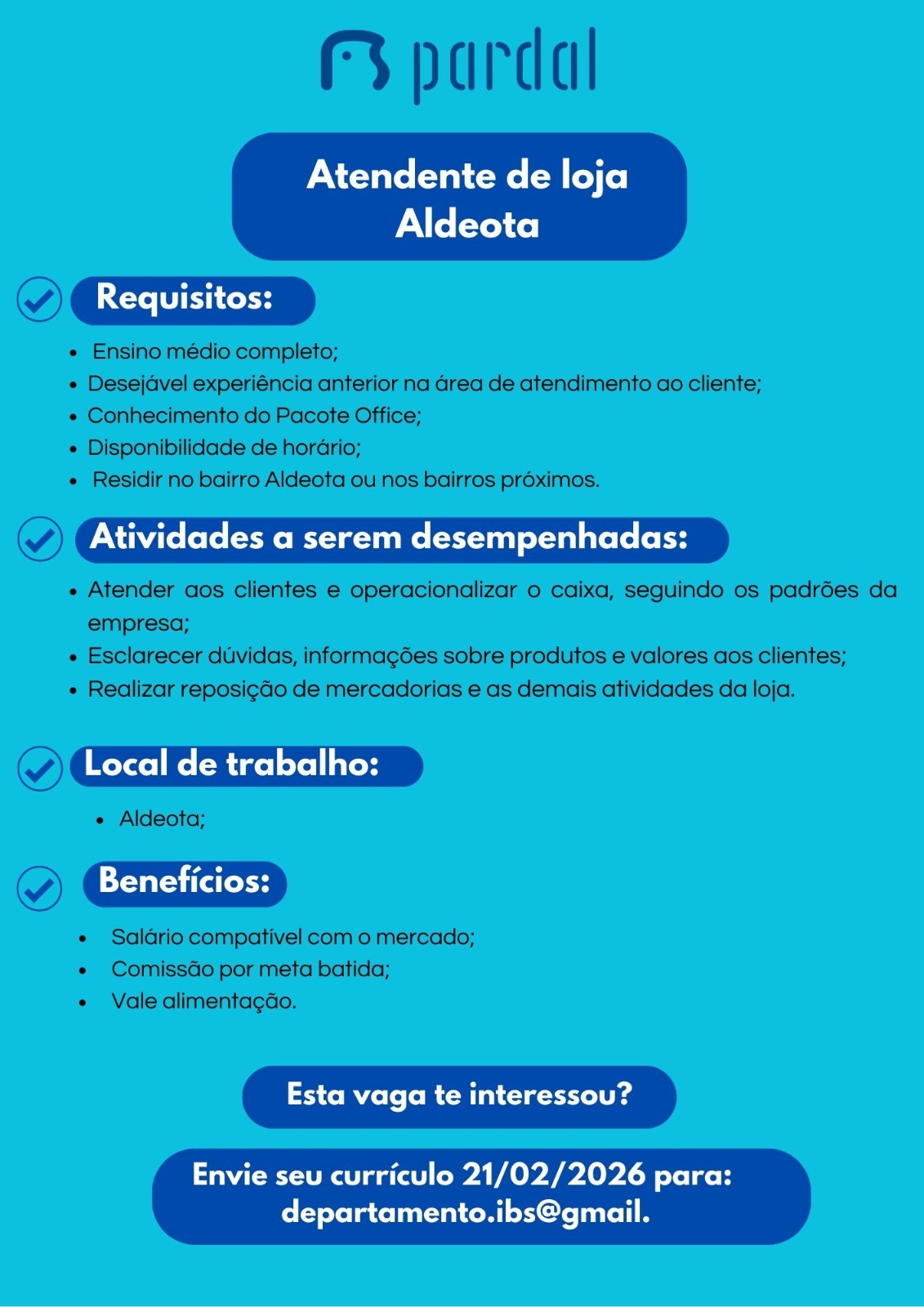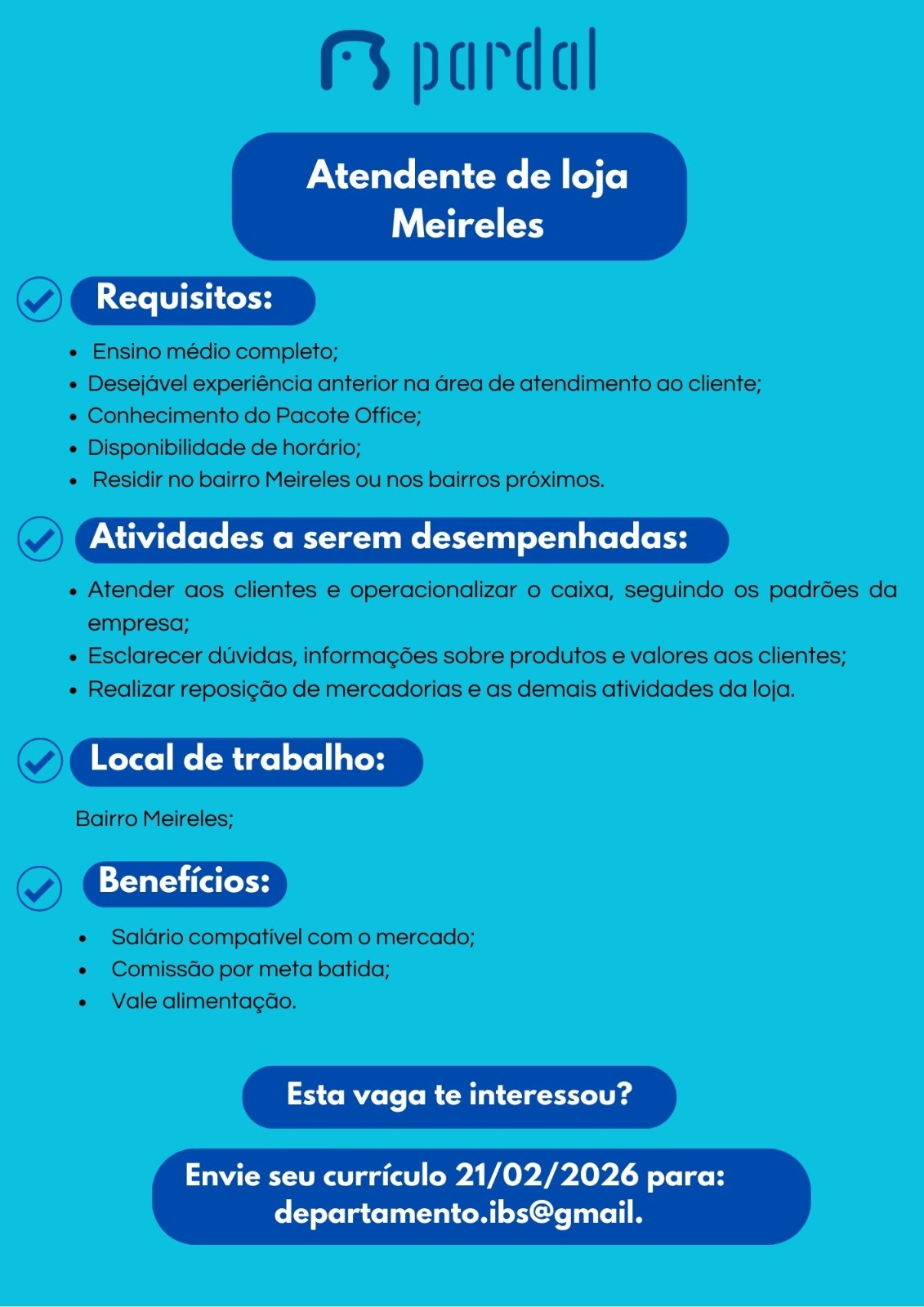 As vagas são divulgadas da mesma forma que recebemos. Não nos responsabilizamos pelas vagas, nem pelas informações fornecidas referente as mesmas, também não nos responsabilizamos pela idoneidade das empresas e instituições, apenas divulgamos as vagas que recebemos. Alertamos à buscar informações sobre as empresas que estão disponibilizando as vagas, através de contato por telefone ou e-mail divulgados nas mesmas, além de pesquisar na internet ou outros meios. Tome muito cuidado com locais (empresas ou instituições) que cobram taxas para garantir vagas ou para garantir uma colocação no mercado de trabalho. Esteja atento (a) a localização (endereço) da entrevista e do local de trabalho, se não conhecer ou achar que é um lugar isolado, vá com uma companhia ou não vá. Ter um emprego para garantir seu sustento e de sua família é importante, mas sua segurança e integridade também é, por isso, esteja atento. Se você é menor de idade vá acompanhado (a) de um (a) responsável.