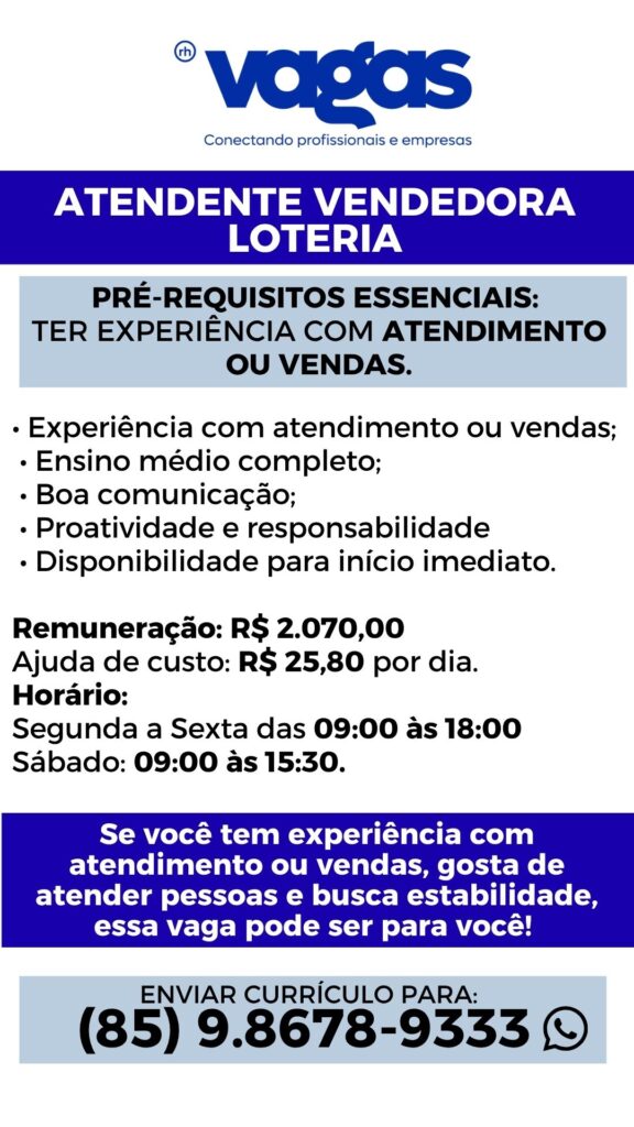 As vagas são divulgadas da mesma forma que recebemos. Não nos responsabilizamos pelas vagas, nem pelas informações fornecidas referente as mesmas, também não nos responsabilizamos pela idoneidade das empresas e instituições, apenas divulgamos as vagas que recebemos. Alertamos à buscar informações sobre as empresas que estão disponibilizando as vagas, através de contato por telefone ou e-mail divulgados nas mesmas, além de pesquisar na internet ou outros meios. Tome muito cuidado com locais (empresas ou instituições) que cobram taxas para garantir vagas ou para garantir uma colocação no mercado de trabalho. Esteja atento (a) a localização (endereço) da entrevista e do local de trabalho, se não conhecer ou achar que é um lugar isolado, vá com uma companhia ou não vá. Ter um emprego para garantir seu sustento e de sua família é importante, mas sua segurança e integridade também é, por isso, esteja atento. Se você é menor de idade vá acompanhado (a) de um (a) responsável.