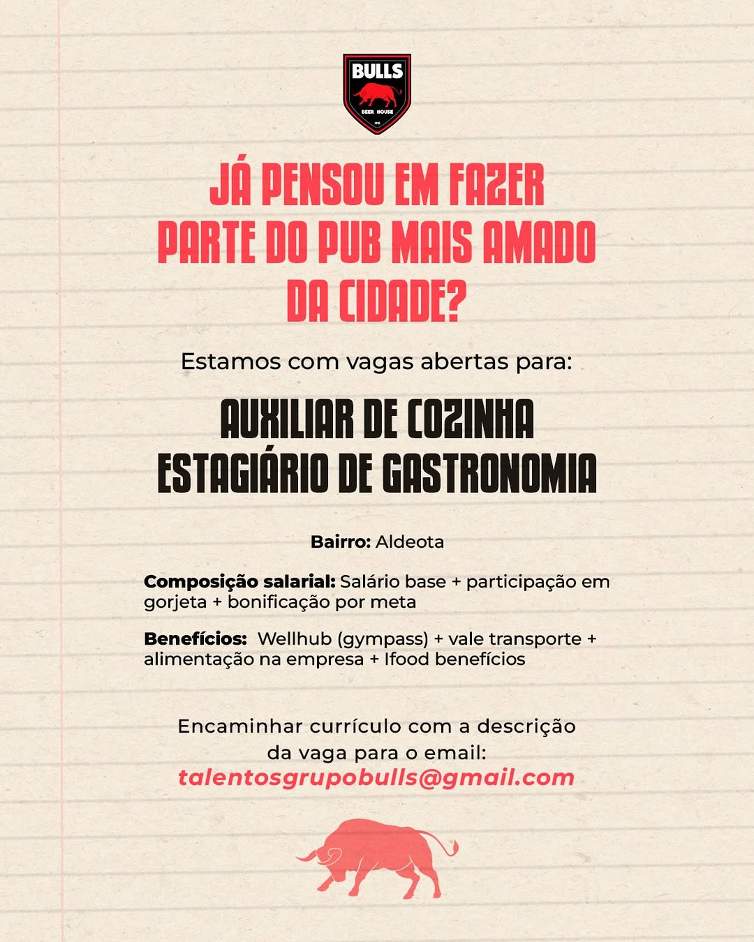 Nós não somos agência de empregos, não cobramos nada, nem antes e nem depois de você conseguir o seu emprego. Não somos nós que realizamos a seleção de currículos, também não realizamos entrevistas. Não nos responsabilizamos pelo envio de currículos. O envio de currículo deverá ser realizado pela pessoa interessada no e-mail que estiver na vaga.