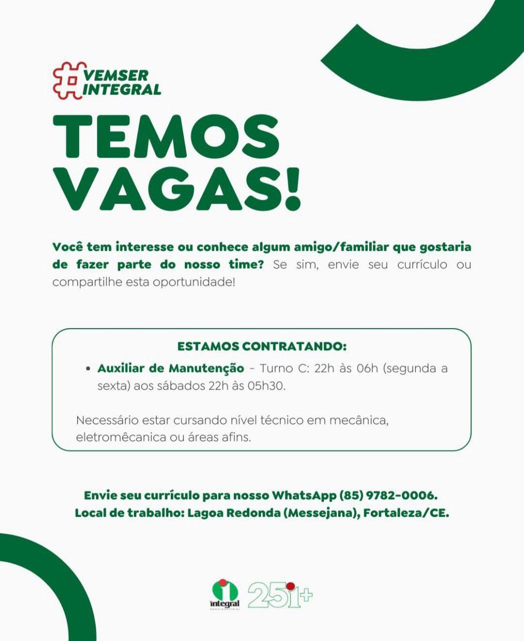 As vagas são divulgadas da mesma forma que recebemos. Não nos responsabilizamos pelas vagas, nem pelas informações fornecidas referente as mesmas, também não nos responsabilizamos pela idoneidade das empresas e instituições, apenas divulgamos as vagas que recebemos. Alertamos à buscar informações sobre as empresas que estão disponibilizando as vagas, através de contato por telefone ou e-mail divulgados nas mesmas, além de pesquisar na internet ou outros meios. Tome muito cuidado com locais (empresas ou instituições) que cobram taxas para garantir vagas ou para garantir uma colocação no mercado de trabalho. Esteja atento (a) a localização (endereço) da entrevista e do local de trabalho, se não conhecer ou achar que é um lugar isolado, vá com uma companhia ou não vá. Ter um emprego para garantir seu sustento e de sua família é importante, mas sua segurança e integridade também é, por isso, esteja atento. Se você é menor de idade vá acompanhado (a) de um (a) responsável.