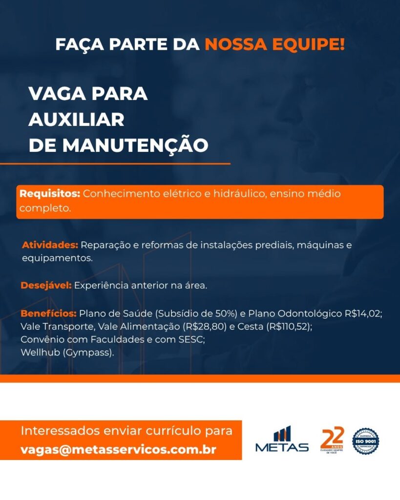 As vagas são divulgadas da mesma forma que recebemos. Não nos responsabilizamos pelas vagas, nem pelas informações fornecidas referente as mesmas, também não nos responsabilizamos pela idoneidade das empresas e instituições, apenas divulgamos as vagas que recebemos. Alertamos à buscar informações sobre as empresas que estão disponibilizando as vagas, através de contato por telefone ou e-mail divulgados nas mesmas, além de pesquisar na internet ou outros meios. Tome muito cuidado com locais (empresas ou instituições) que cobram taxas para garantir vagas ou para garantir uma colocação no mercado de trabalho. Esteja atento (a) a localização (endereço) da entrevista e do local de trabalho, se não conhecer ou achar que é um lugar isolado, vá com uma companhia ou não vá. Ter um emprego para garantir seu sustento e de sua família é importante, mas sua segurança e integridade também é, por isso, esteja atento. Se você é menor de idade vá acompanhado (a) de um (a) responsável.