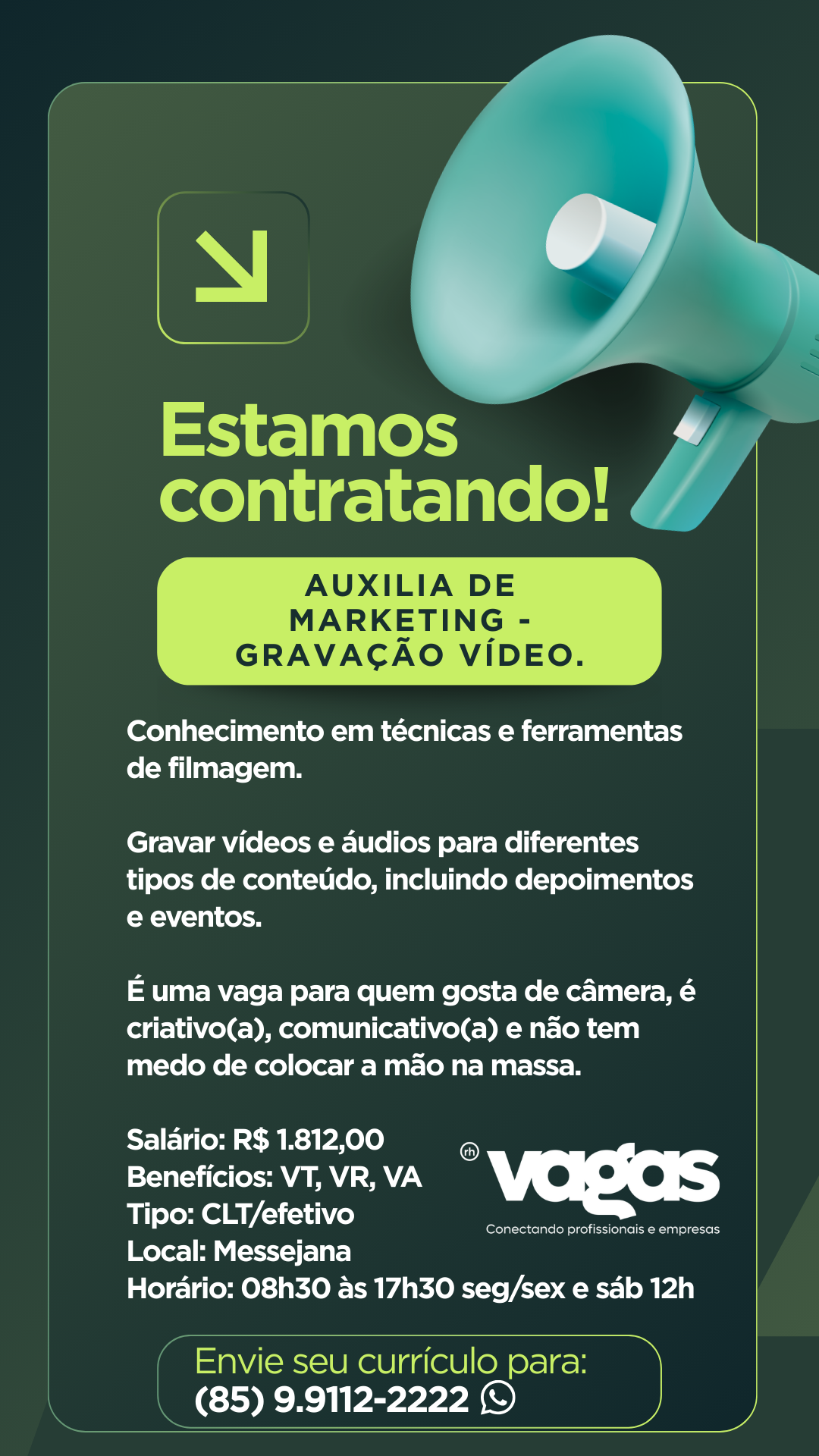 As vagas são divulgadas da mesma forma que recebemos. Não nos responsabilizamos pelas vagas, nem pelas informações fornecidas referente as mesmas, também não nos responsabilizamos pela idoneidade das empresas e instituições, apenas divulgamos as vagas que recebemos. Alertamos à buscar informações sobre as empresas que estão disponibilizando as vagas, através de contato por telefone ou e-mail divulgados nas mesmas, além de pesquisar na internet ou outros meios. Tome muito cuidado com locais (empresas ou instituições) que cobram taxas para garantir vagas ou para garantir uma colocação no mercado de trabalho. Esteja atento (a) a localização (endereço) da entrevista e do local de trabalho, se não conhecer ou achar que é um lugar isolado, vá com uma companhia ou não vá. Ter um emprego para garantir seu sustento e de sua família é importante, mas sua segurança e integridade também é, por isso, esteja atento. Se você é menor de idade vá acompanhado (a) de um (a) responsável.