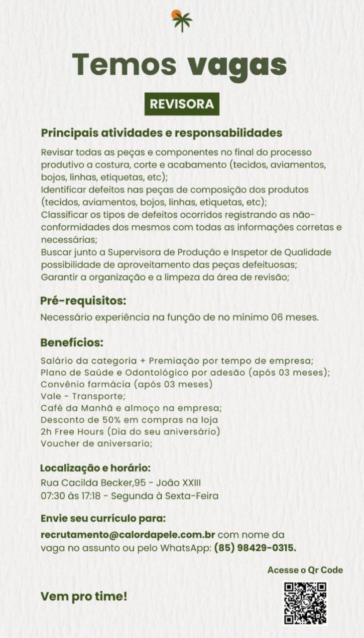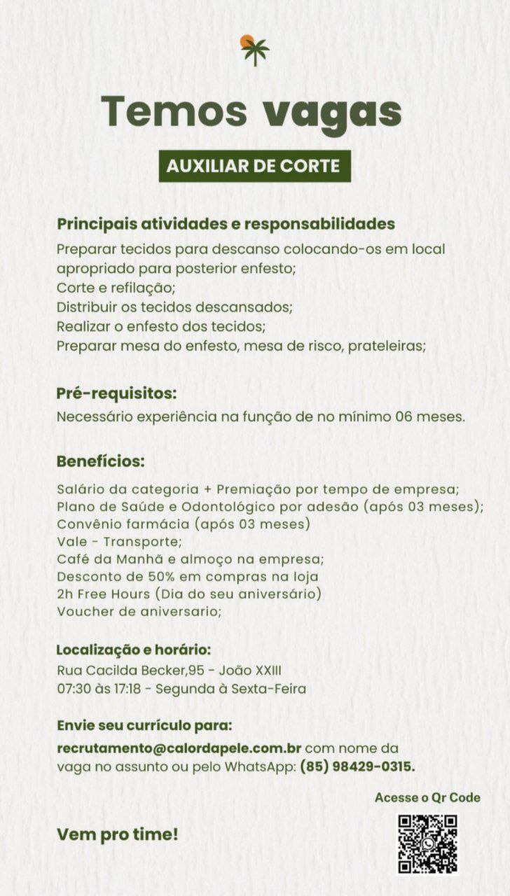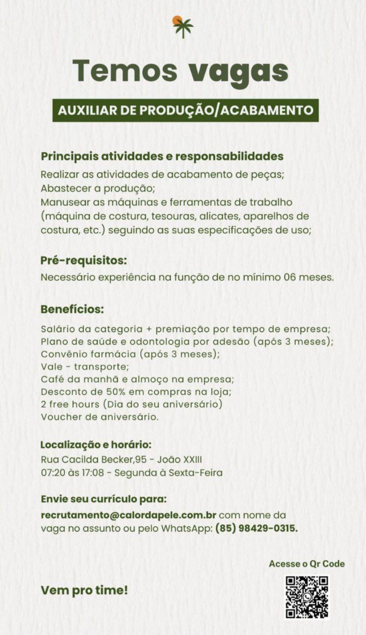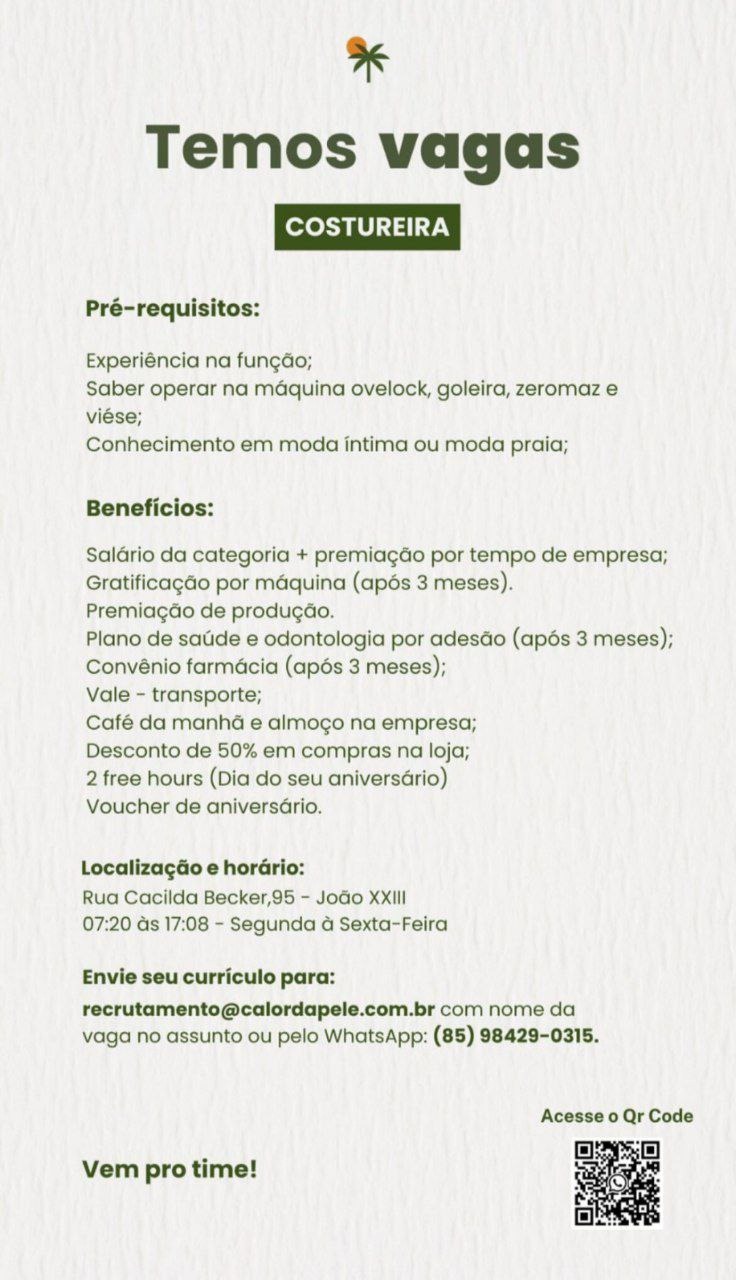 Auxiliar de Produção, Costureira, Auxiliar de Corte, Revisora, Auxiliar de Expedição