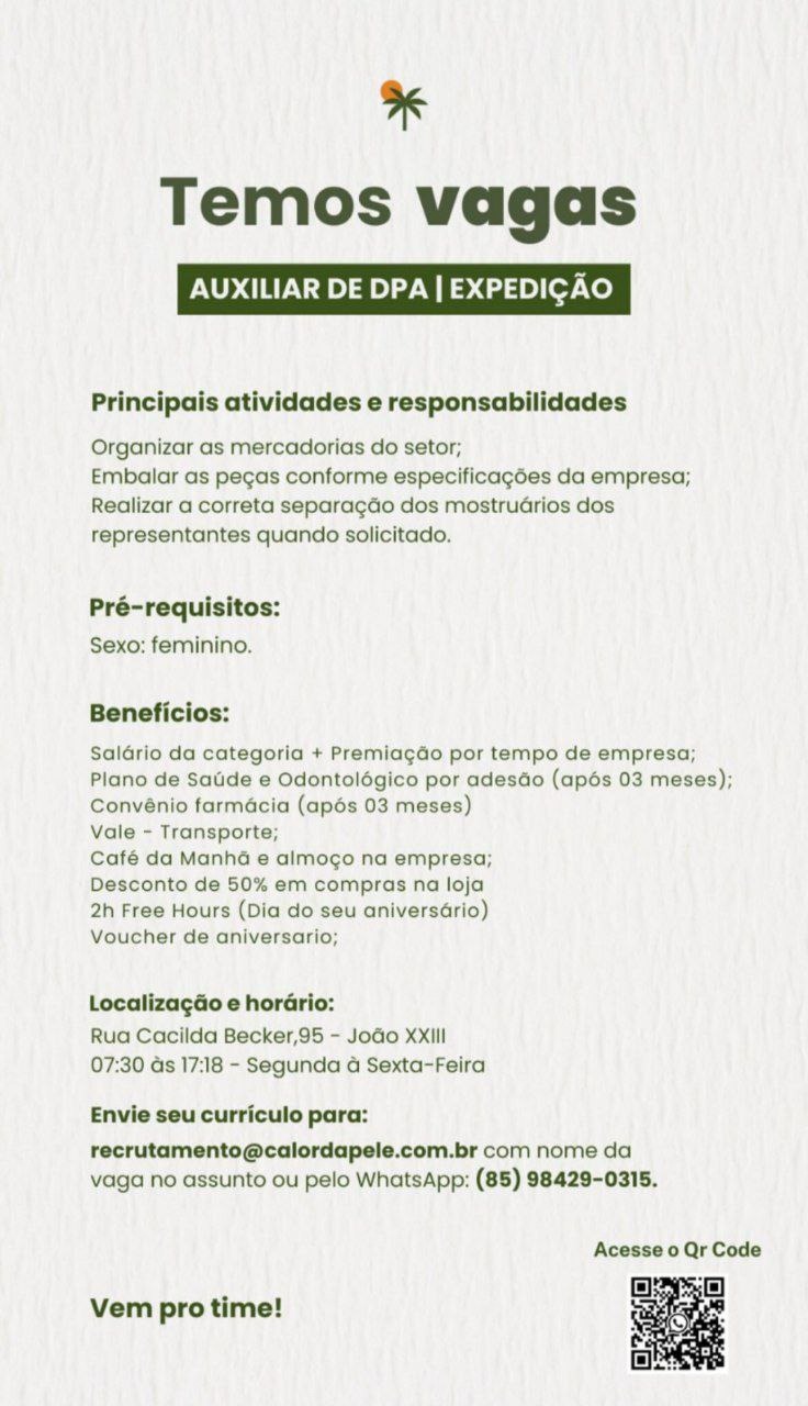 As vagas são divulgadas da mesma forma que recebemos. Não nos responsabilizamos pelas vagas, nem pelas informações fornecidas referente as mesmas, também não nos responsabilizamos pela idoneidade das empresas e instituições, apenas divulgamos as vagas que recebemos. Alertamos à buscar informações sobre as empresas que estão disponibilizando as vagas, através de contato por telefone ou e-mail divulgados nas mesmas, além de pesquisar na internet ou outros meios. Tome muito cuidado com locais (empresas ou instituições) que cobram taxas para garantir vagas ou para garantir uma colocação no mercado de trabalho. Esteja atento (a) a localização (endereço) da entrevista e do local de trabalho, se não conhecer ou achar que é um lugar isolado, vá com uma companhia ou não vá. Ter um emprego para garantir seu sustento e de sua família é importante, mas sua segurança e integridade também é, por isso, esteja atento. Se você é menor de idade vá acompanhado (a) de um (a) responsável.