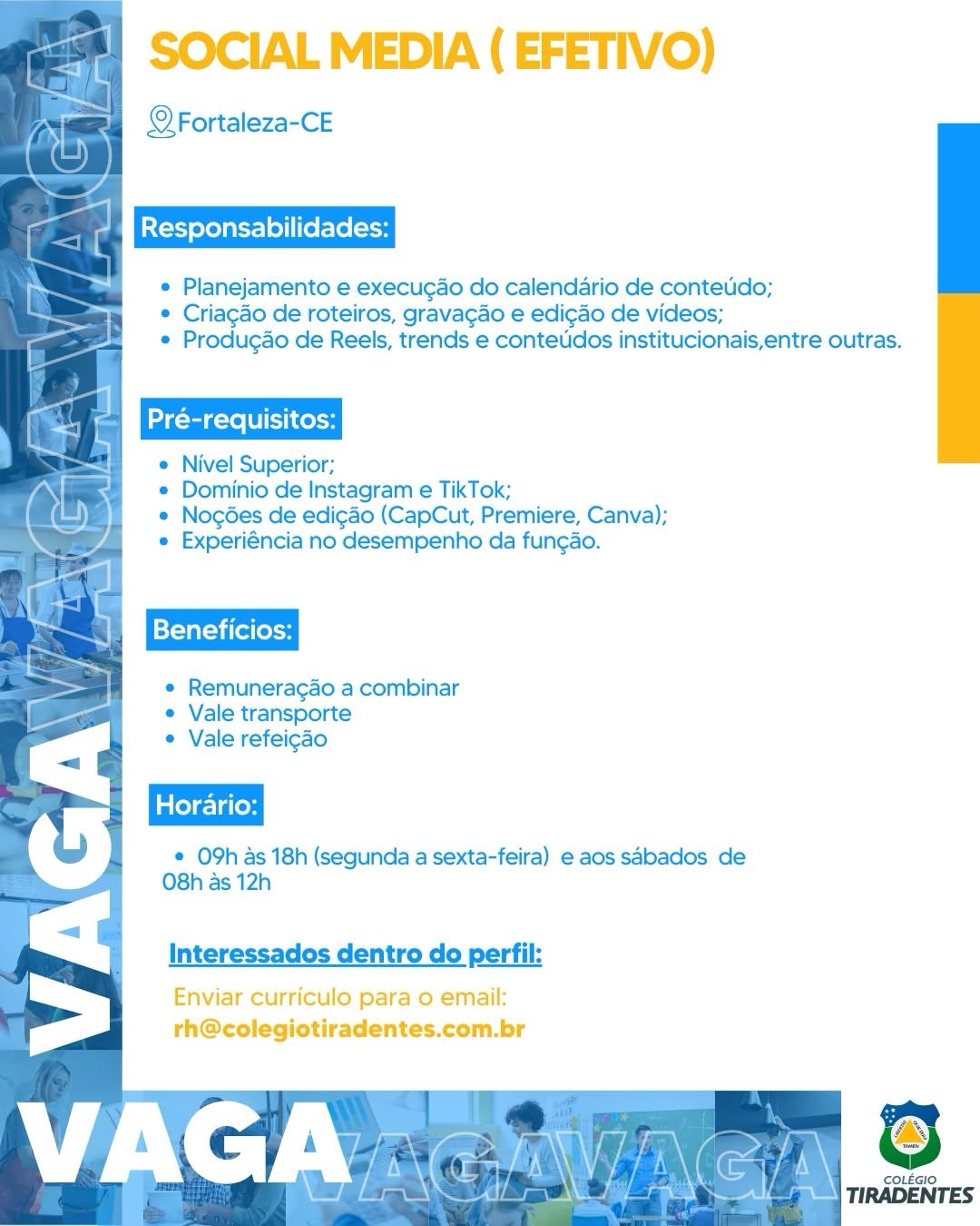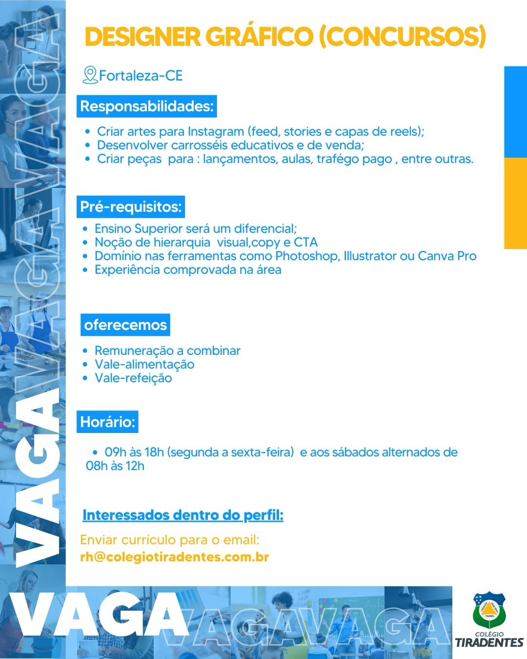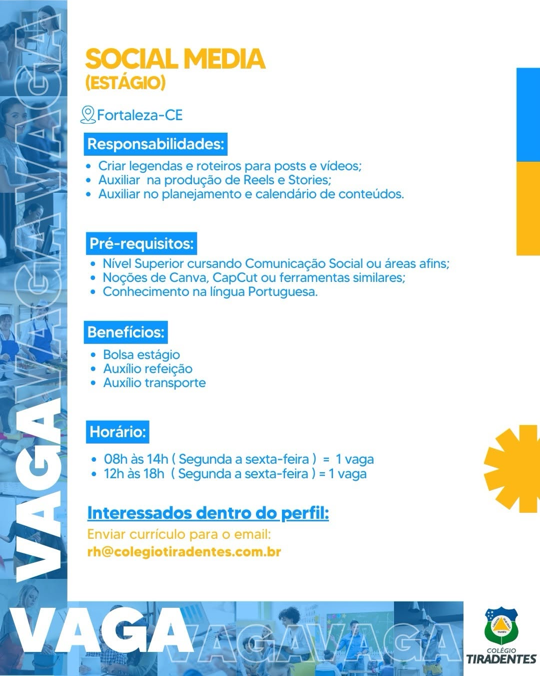 Auxiliar de Sala, Designer Gráfico, Assistente de Vendas, Social Media, Estagiário Social Media