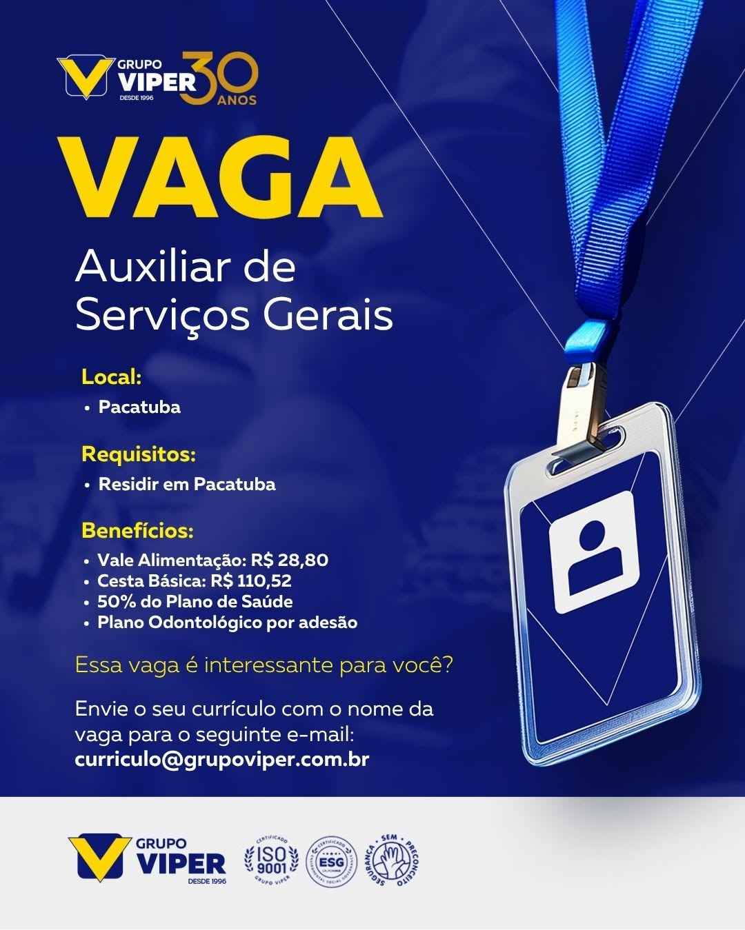 Nós não somos agência de empregos, não cobramos nada, nem antes e nem depois de você conseguir o seu emprego. Não somos nós que realizamos a seleção de currículos, também não realizamos entrevistas. Não nos responsabilizamos pelo envio de currículos. O envio de currículo deverá ser realizado pela pessoa interessada no e-mail que estiver na vaga.