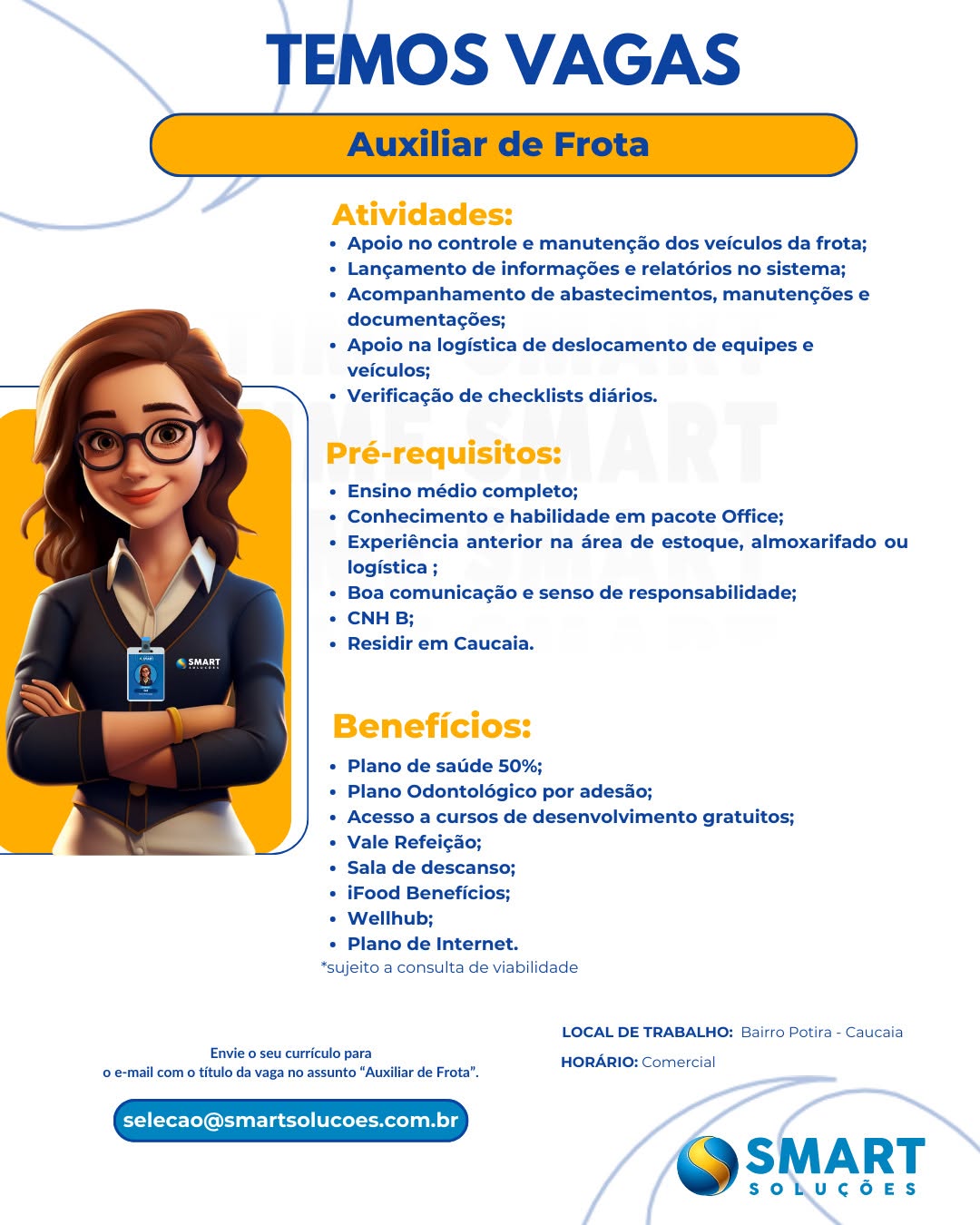 As vagas são divulgadas da mesma forma que recebemos. Não nos responsabilizamos pelas vagas, nem pelas informações fornecidas referente as mesmas, também não nos responsabilizamos pela idoneidade das empresas e instituições, apenas divulgamos as vagas que recebemos. Alertamos à buscar informações sobre as empresas que estão disponibilizando as vagas, através de contato por telefone ou e-mail divulgados nas mesmas, além de pesquisar na internet ou outros meios. Tome muito cuidado com locais (empresas ou instituições) que cobram taxas para garantir vagas ou para garantir uma colocação no mercado de trabalho. Esteja atento (a) a localização (endereço) da entrevista e do local de trabalho, se não conhecer ou achar que é um lugar isolado, vá com uma companhia ou não vá. Ter um emprego para garantir seu sustento e de sua família é importante, mas sua segurança e integridade também é, por isso, esteja atento. Se você é menor de idade vá acompanhado (a) de um (a) responsável.