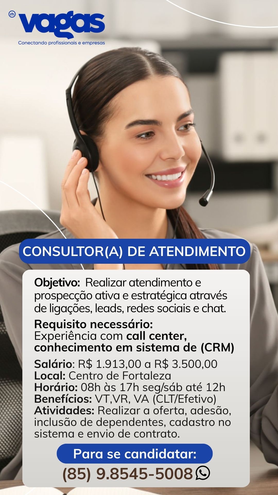 Necessário ter experiência com call center, serviços e conhecimento com sistema (CRM).