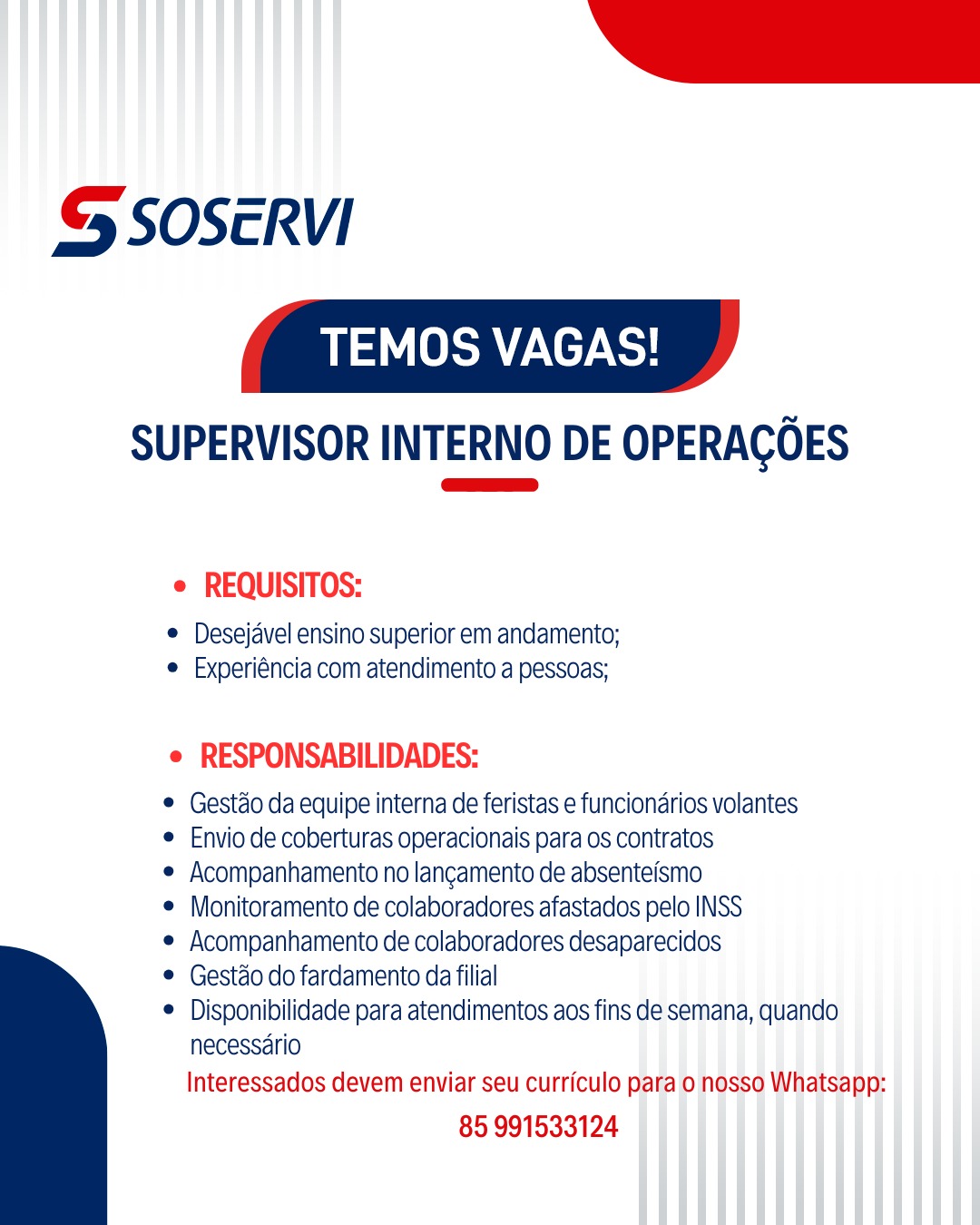 As vagas são divulgadas da mesma forma que recebemos. Não nos responsabilizamos pelas vagas, nem pelas informações fornecidas referente as mesmas, também não nos responsabilizamos pela idoneidade das empresas e instituições, apenas divulgamos as vagas que recebemos. Alertamos à buscar informações sobre as empresas que estão disponibilizando as vagas, através de contato por telefone ou e-mail divulgados nas mesmas, além de pesquisar na internet ou outros meios. Tome muito cuidado com locais (empresas ou instituições) que cobram taxas para garantir vagas ou para garantir uma colocação no mercado de trabalho. Esteja atento (a) a localização (endereço) da entrevista e do local de trabalho, se não conhecer ou achar que é um lugar isolado, vá com uma companhia ou não vá. Ter um emprego para garantir seu sustento e de sua família é importante, mas sua segurança e integridade também é, por isso, esteja atento. Se você é menor de idade vá acompanhado (a) de um (a) responsável.