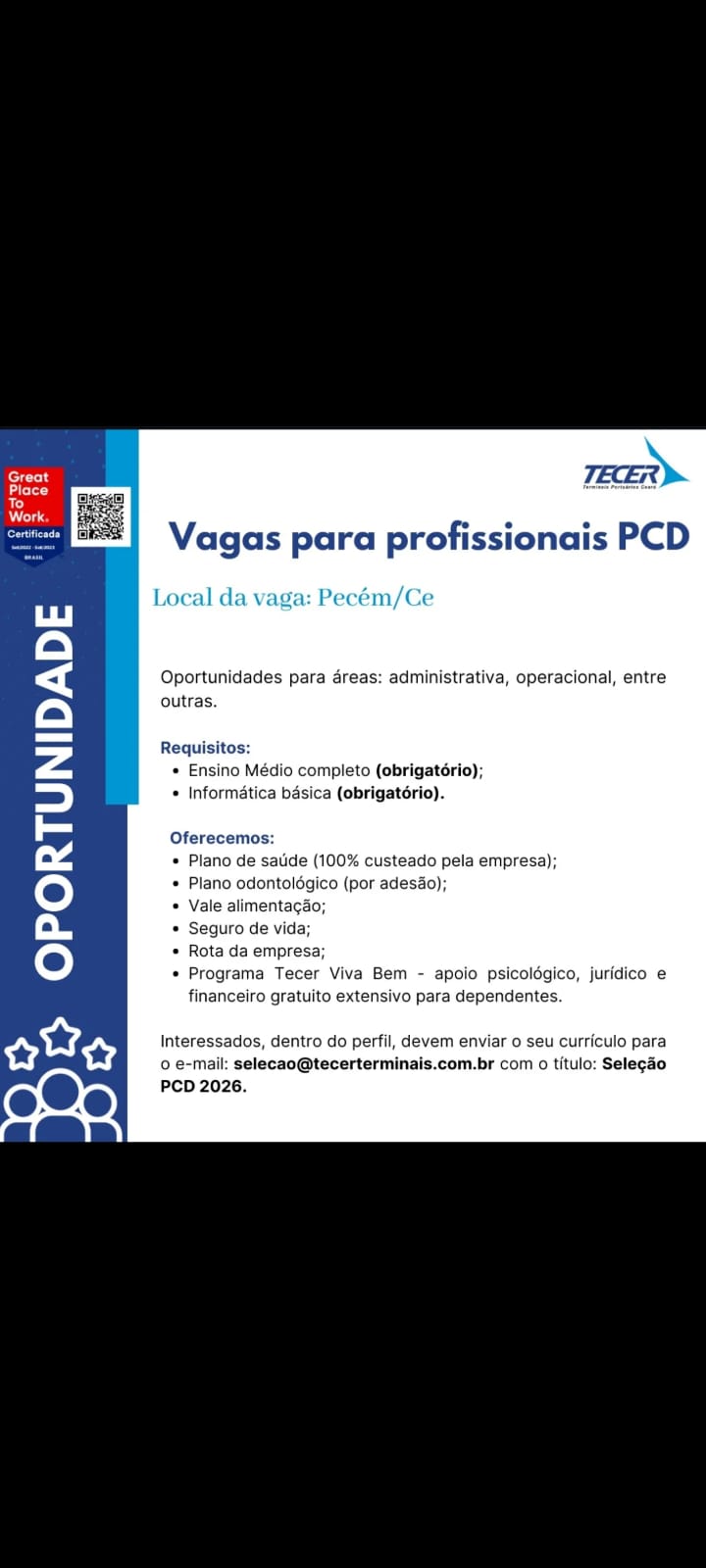 Nós não somos agência de empregos, não cobramos nada, nem antes e nem depois de você conseguir o seu emprego. Não somos nós que realizamos a seleção de currículos, também não realizamos entrevistas. Não nos responsabilizamos pelo envio de currículos. O envio de currículo deverá ser realizado pela pessoa interessada no e-mail que estiver na vaga.