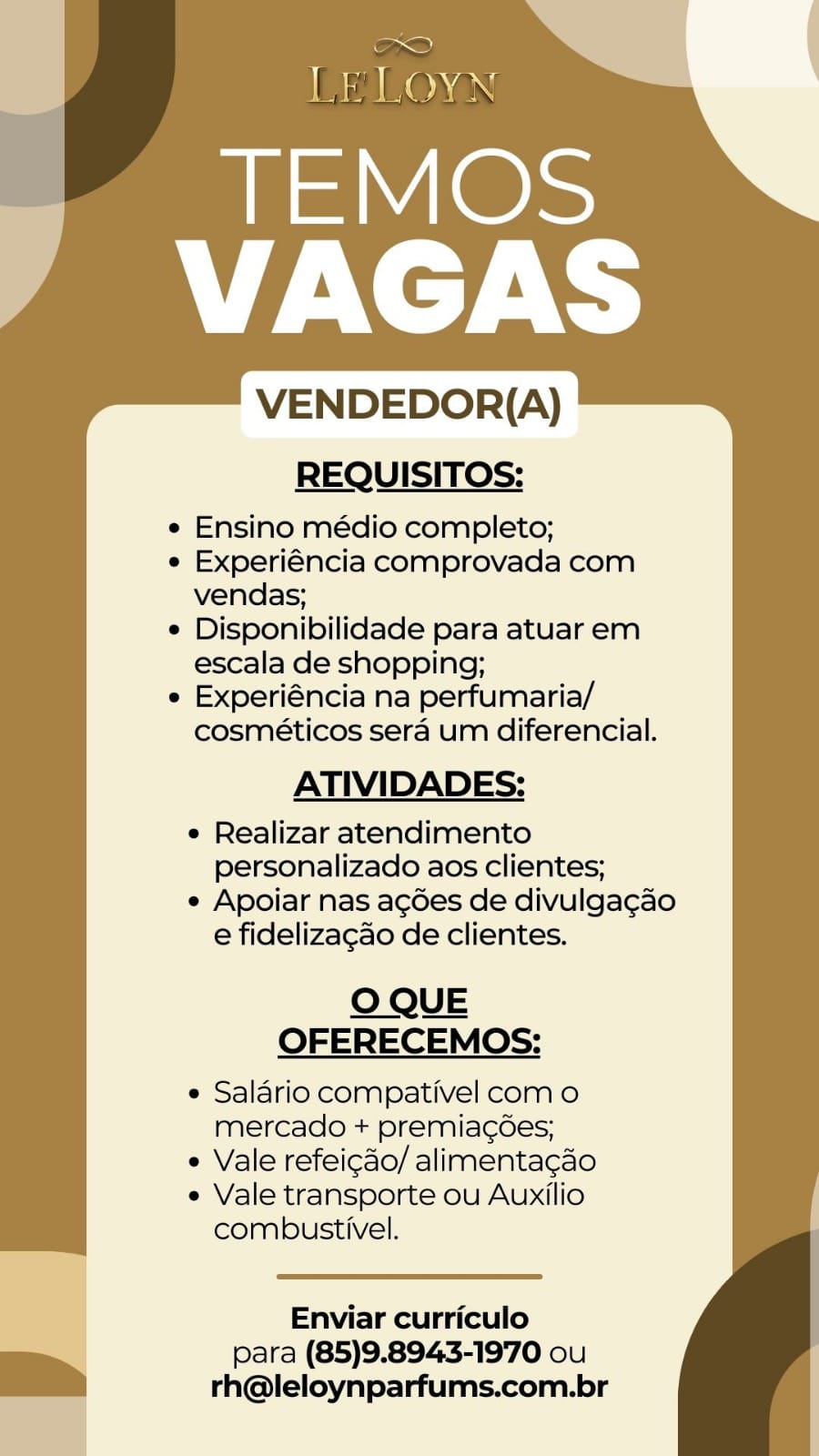 As vagas são divulgadas da mesma forma que recebemos. Não nos responsabilizamos pelas vagas, nem pelas informações fornecidas referente as mesmas, também não nos responsabilizamos pela idoneidade das empresas e instituições, apenas divulgamos as vagas que recebemos. Alertamos à buscar informações sobre as empresas que estão disponibilizando as vagas, através de contato por telefone ou e-mail divulgados nas mesmas, além de pesquisar na internet ou outros meios. Tome muito cuidado com locais (empresas ou instituições) que cobram taxas para garantir vagas ou para garantir uma colocação no mercado de trabalho. Esteja atento (a) a localização (endereço) da entrevista e do local de trabalho, se não conhecer ou achar que é um lugar isolado, vá com uma companhia ou não vá. Ter um emprego para garantir seu sustento e de sua família é importante, mas sua segurança e integridade também é, por isso, esteja atento. Se você é menor de idade vá acompanhado (a) de um (a) responsável.