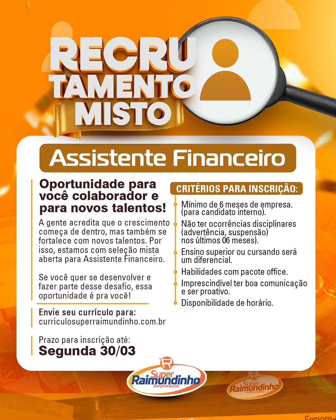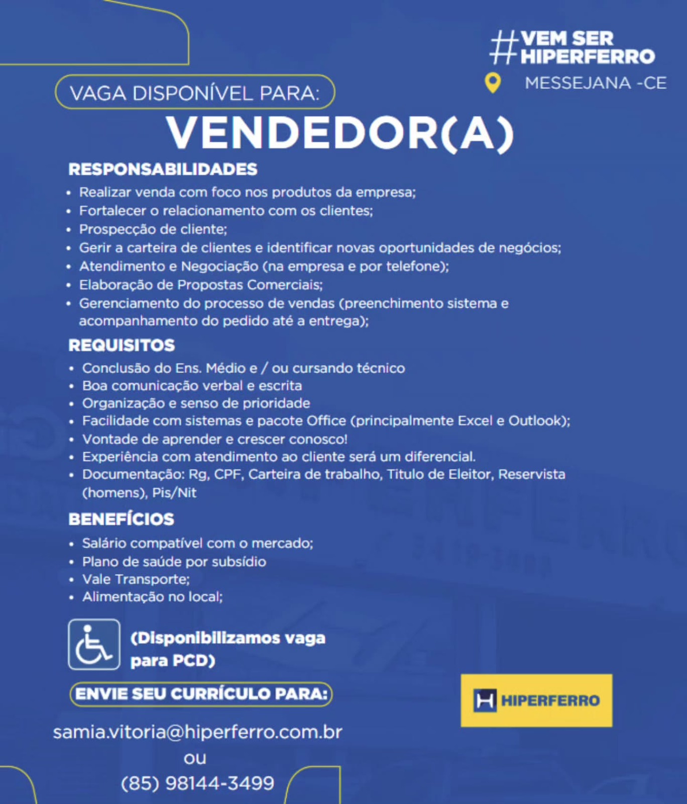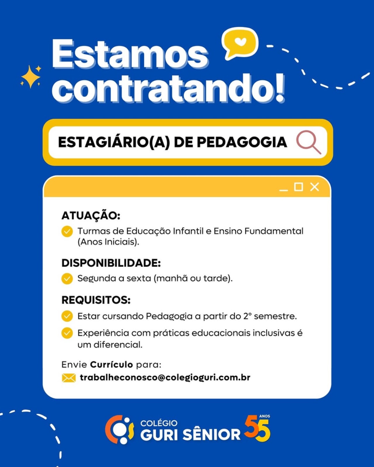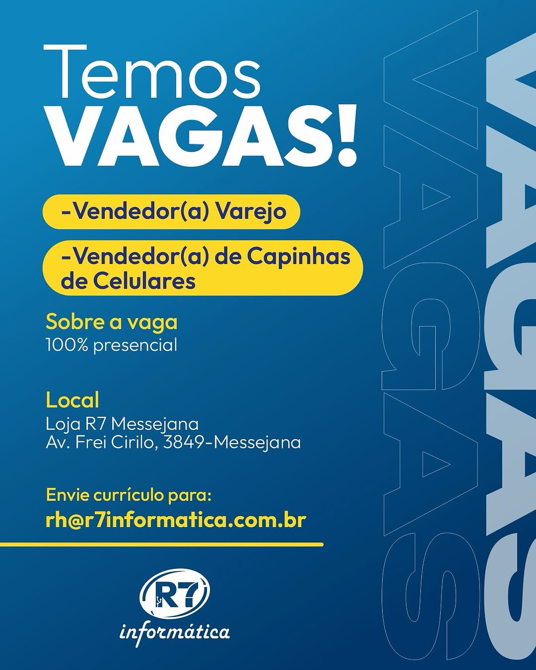 Nós não somos agência de empregos, não cobramos nada, nem antes e nem depois de você conseguir o seu emprego. Não somos nós que realizamos a seleção de currículos, também não realizamos entrevistas. Não nos responsabilizamos pelo envio de currículos. O envio de currículo deverá ser realizado pela pessoa interessada no e-mail que estiver na vaga.