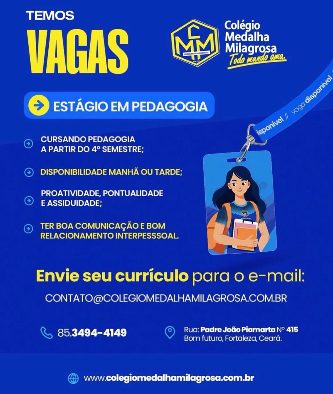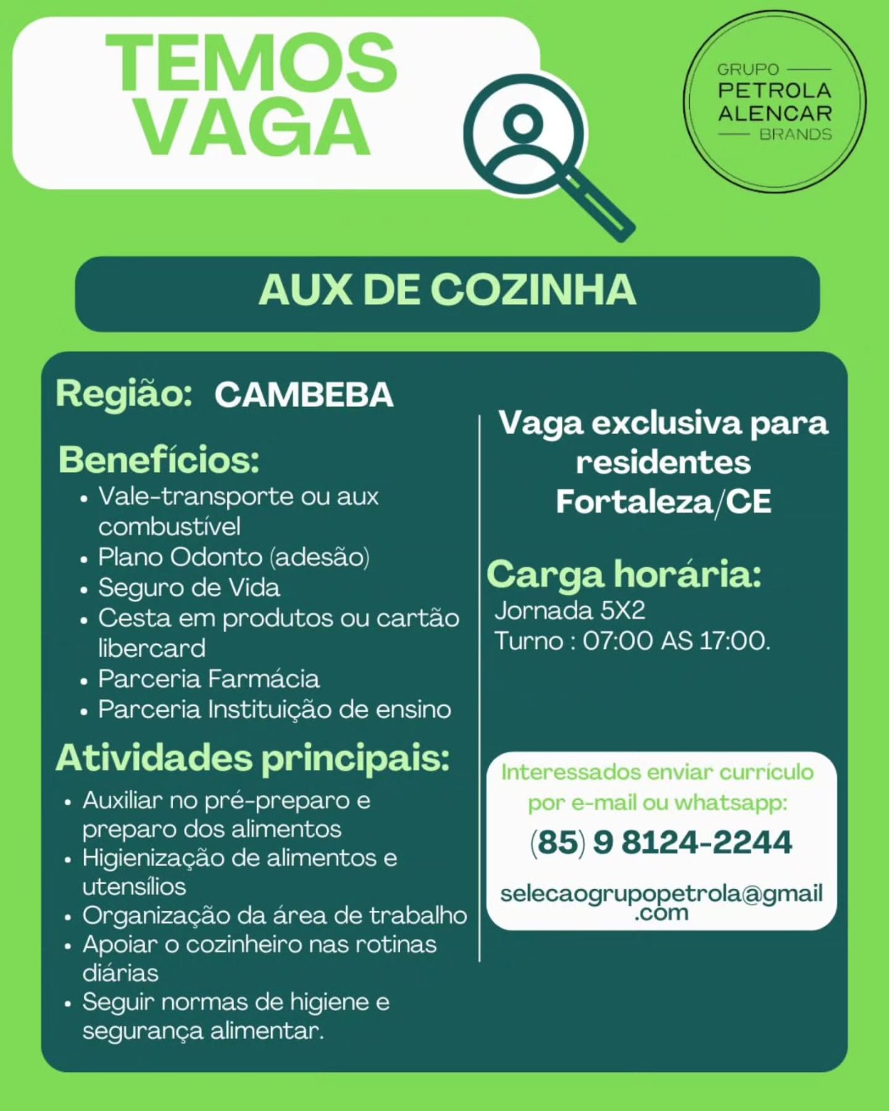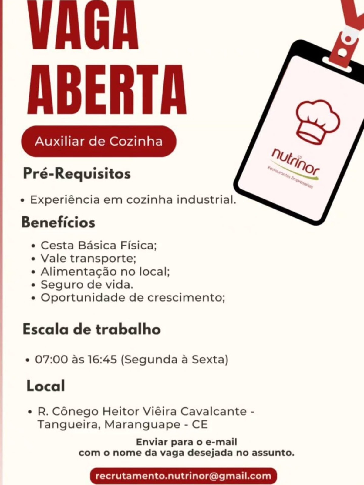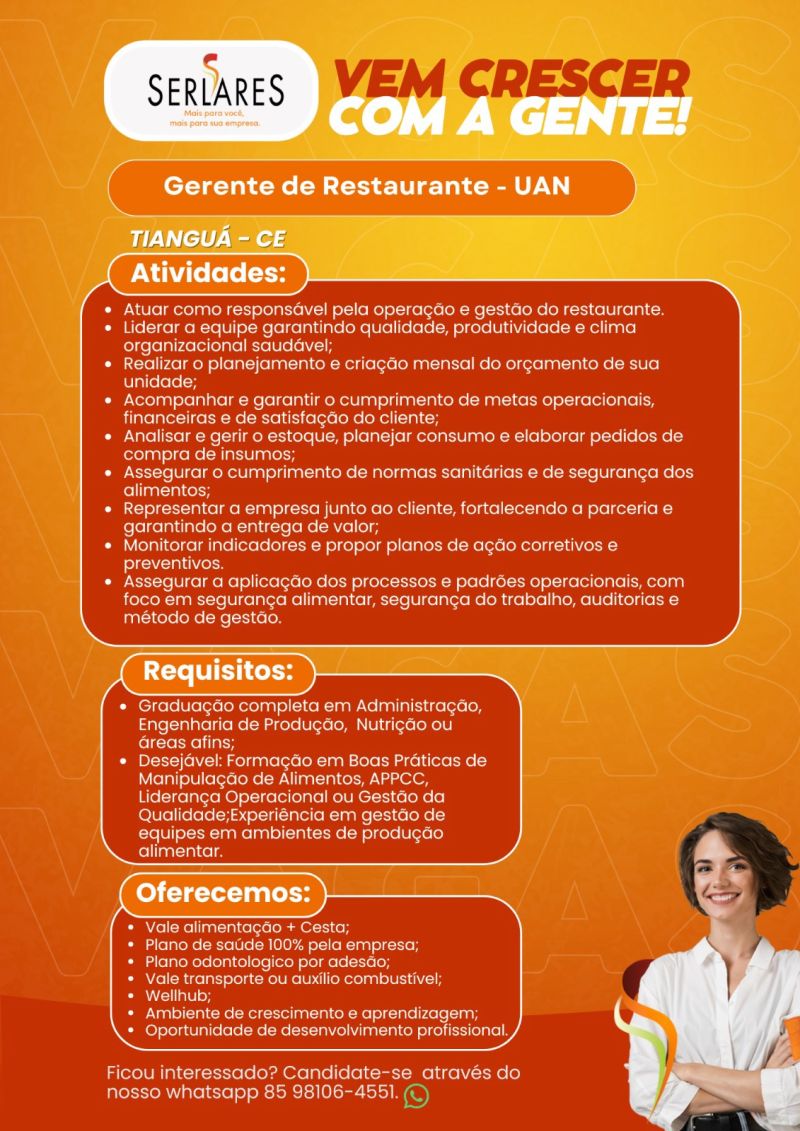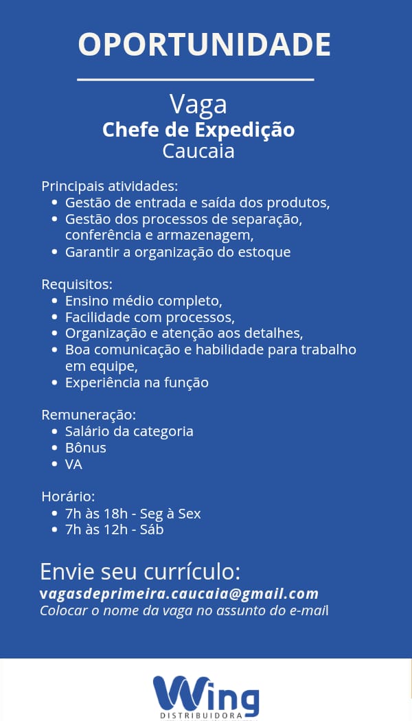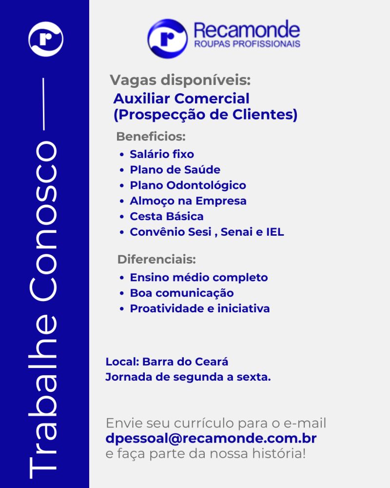 As vagas são divulgadas da mesma forma que recebemos. Não nos responsabilizamos pelas vagas, nem pelas informações fornecidas referente as mesmas, também não nos responsabilizamos pela idoneidade das empresas e instituições, apenas divulgamos as vagas que recebemos. Alertamos à buscar informações sobre as empresas que estão disponibilizando as vagas, através de contato por telefone ou e-mail divulgados nas mesmas, além de pesquisar na internet ou outros meios. Tome muito cuidado com locais (empresas ou instituições) que cobram taxas para garantir vagas ou para garantir uma colocação no mercado de trabalho. Esteja atento (a) a localização (endereço) da entrevista e do local de trabalho, se não conhecer ou achar que é um lugar isolado, vá com uma companhia ou não vá. Ter um emprego para garantir seu sustento e de sua família é importante, mas sua segurança e integridade também é, por isso, esteja atento. Se você é menor de idade vá acompanhado (a) de um (a) responsável.