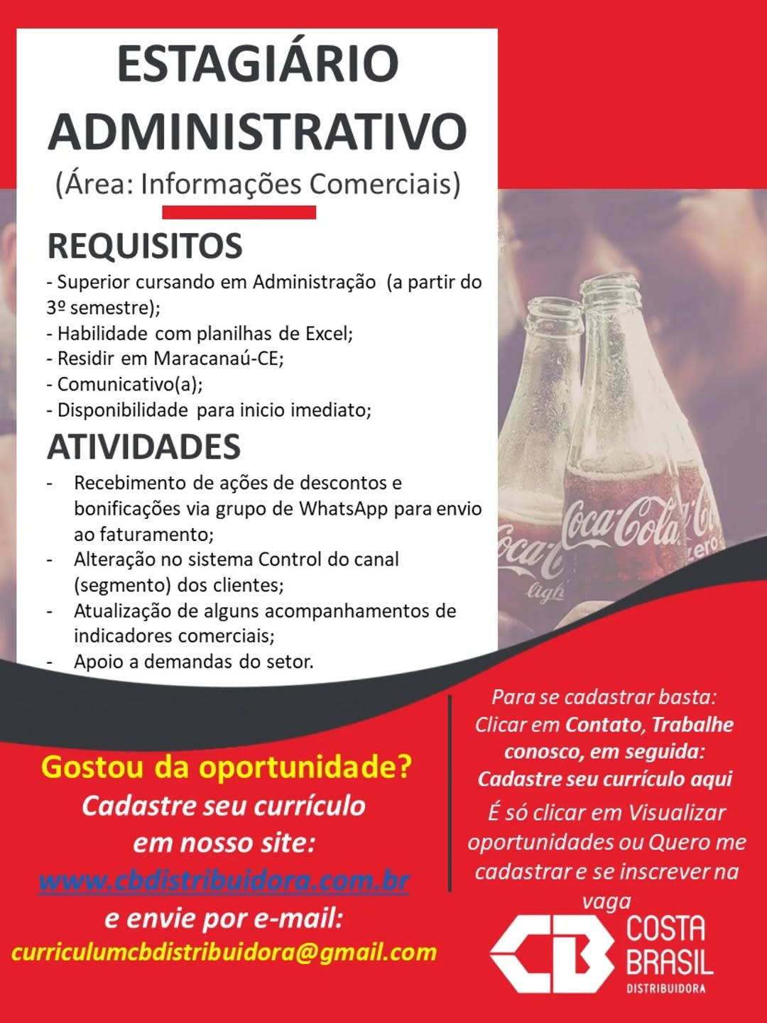 Nós não somos agência de empregos, não cobramos nada, nem antes e nem depois de você conseguir o seu emprego. Não somos nós que realizamos a seleção de currículos, também não realizamos entrevistas. Não nos responsabilizamos pelo envio de currículos. O envio de currículo deverá ser realizado pela pessoa interessada no e-mail que estiver na vaga.