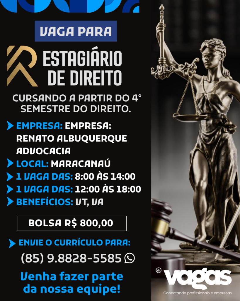 Se você está construindo sua trajetória no Direito e deseja aprender na prática, em um ambiente profissional que valoriza ética, técnica e trabalho em equipe, essa pode ser a oportunidade ideal para crescer conosco.