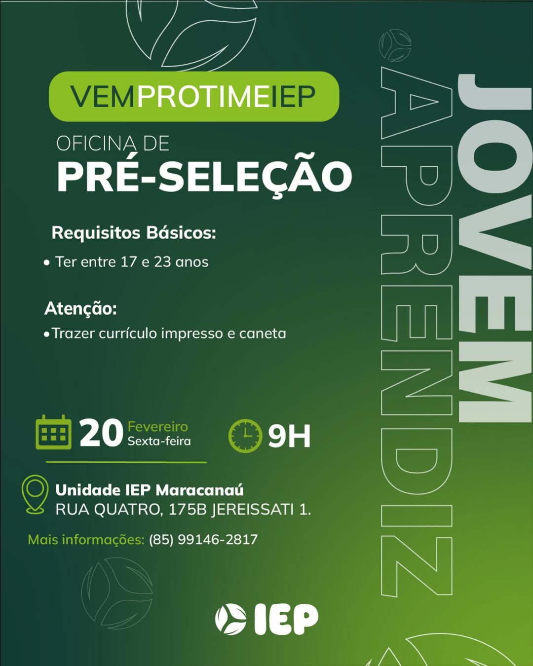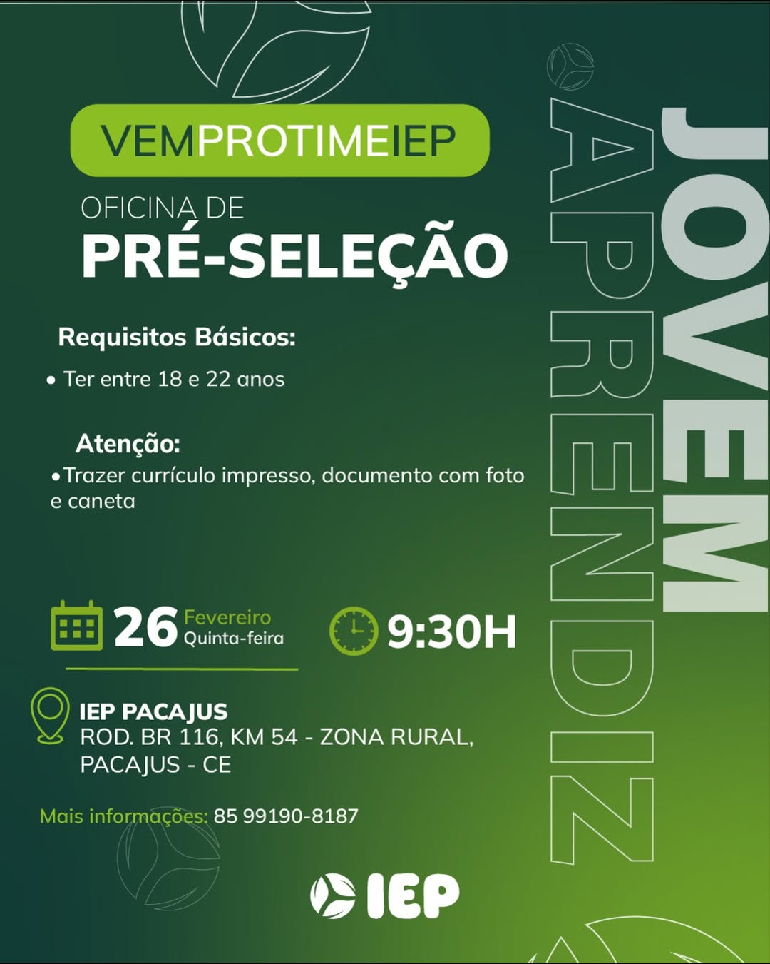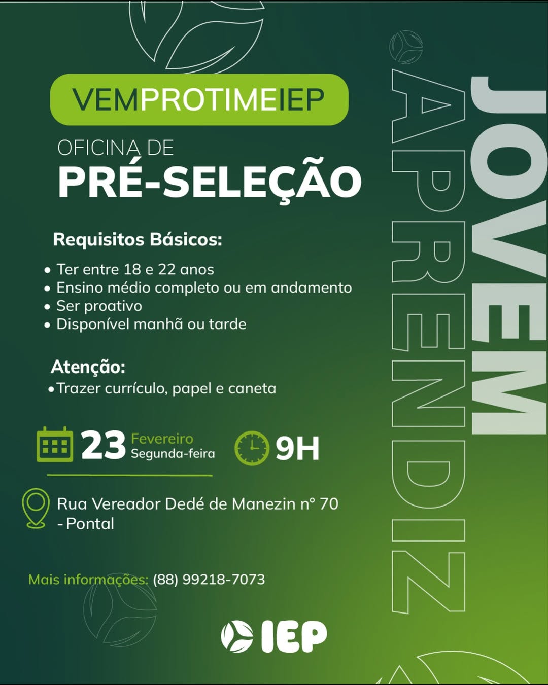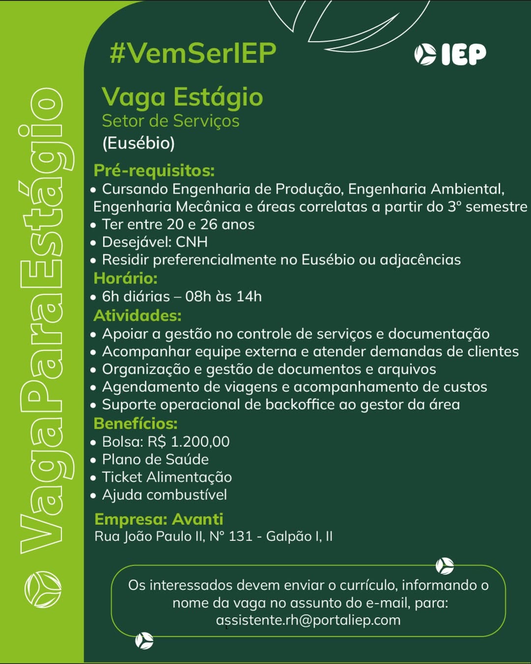 As vagas são divulgadas da mesma forma que recebemos. Não nos responsabilizamos pelas vagas, nem pelas informações fornecidas referente as mesmas, também não nos responsabilizamos pela idoneidade das empresas e instituições, apenas divulgamos as vagas que recebemos. Alertamos à buscar informações sobre as empresas que estão disponibilizando as vagas, através de contato por telefone ou e-mail divulgados nas mesmas, além de pesquisar na internet ou outros meios. Tome muito cuidado com locais (empresas ou instituições) que cobram taxas para garantir vagas ou para garantir uma colocação no mercado de trabalho. Esteja atento (a) a localização (endereço) da entrevista e do local de trabalho, se não conhecer ou achar que é um lugar isolado, vá com uma companhia ou não vá. Ter um emprego para garantir seu sustento e de sua família é importante, mas sua segurança e integridade também é, por isso, esteja atento. Se você é menor de idade vá acompanhado (a) de um (a) responsável.