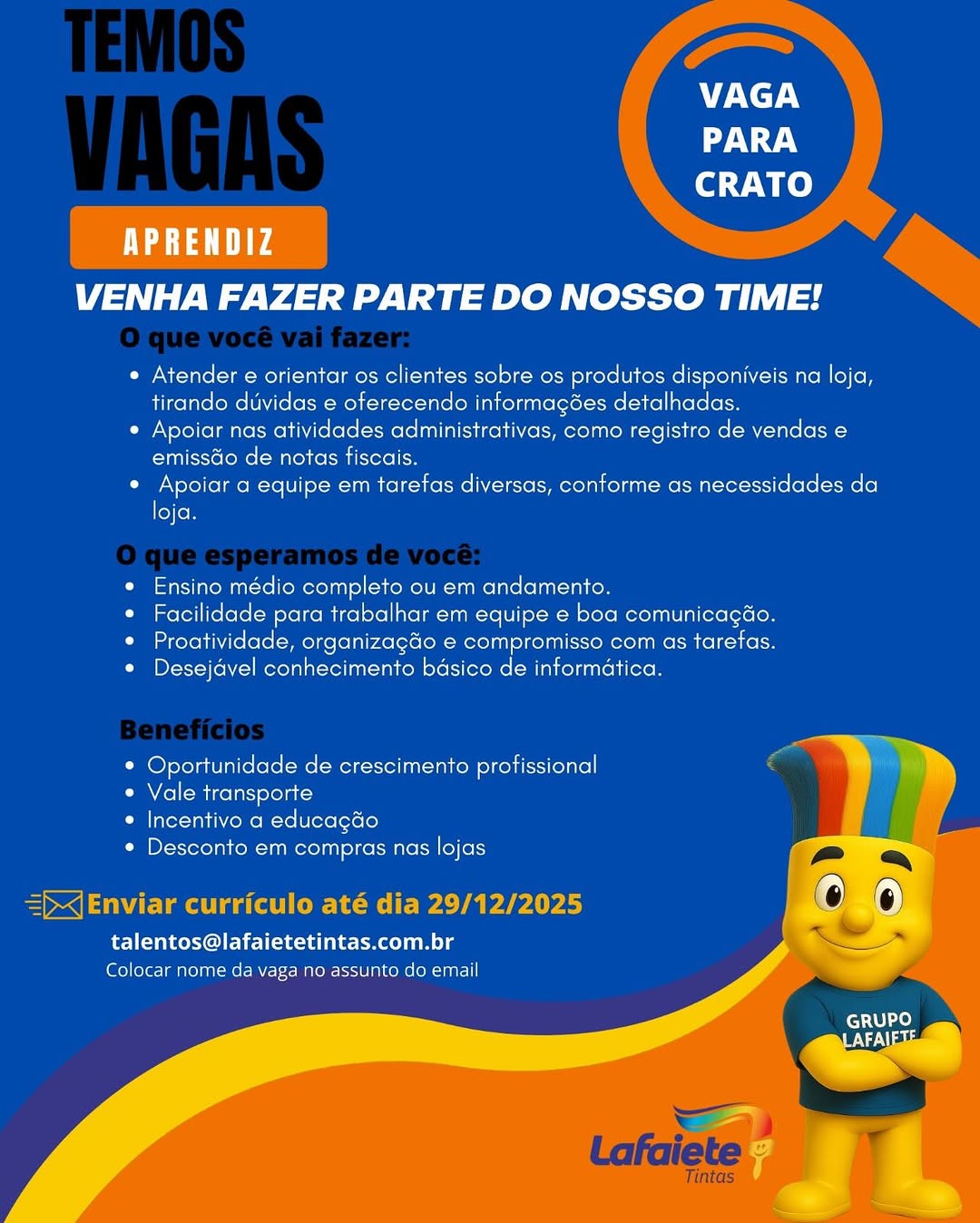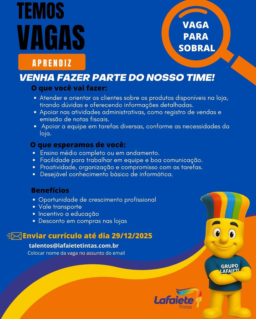 As vagas são divulgadas da mesma forma que recebemos. Não nos responsabilizamos pelas vagas, nem pelas informações fornecidas referente as mesmas, também não nos responsabilizamos pela idoneidade das empresas e instituições, apenas divulgamos as vagas que recebemos. Alertamos à buscar informações sobre as empresas que estão disponibilizando as vagas, através de contato por telefone ou e-mail divulgados nas mesmas, além de pesquisar na internet ou outros meios. Tome muito cuidado com locais (empresas ou instituições) que cobram taxas para garantir vagas ou para garantir uma colocação no mercado de trabalho. Esteja atento (a) a localização (endereço) da entrevista e do local de trabalho, se não conhecer ou achar que é um lugar isolado, vá com uma companhia ou não vá. Ter um emprego para garantir seu sustento e de sua família é importante, mas sua segurança e integridade também é, por isso, esteja atento. Se você é menor de idade vá acompanhado (a) de um (a) responsável.