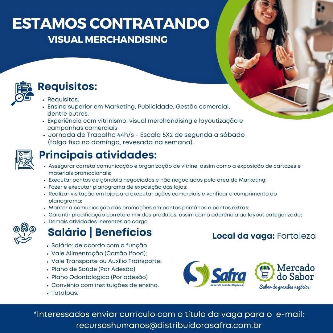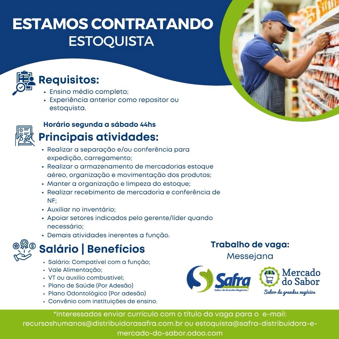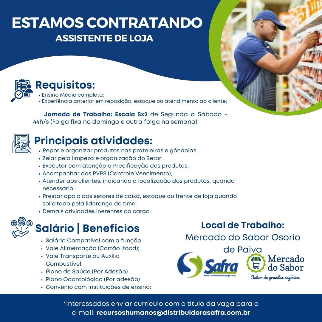 Estoquista, Visual Merchandising, Assistente de Loja, Promotor(a) de Vendas, Vendedor(a) Telemarketing, Assistente de Frota, Vendedor Externo, Auxiliar de Serviços Gerais