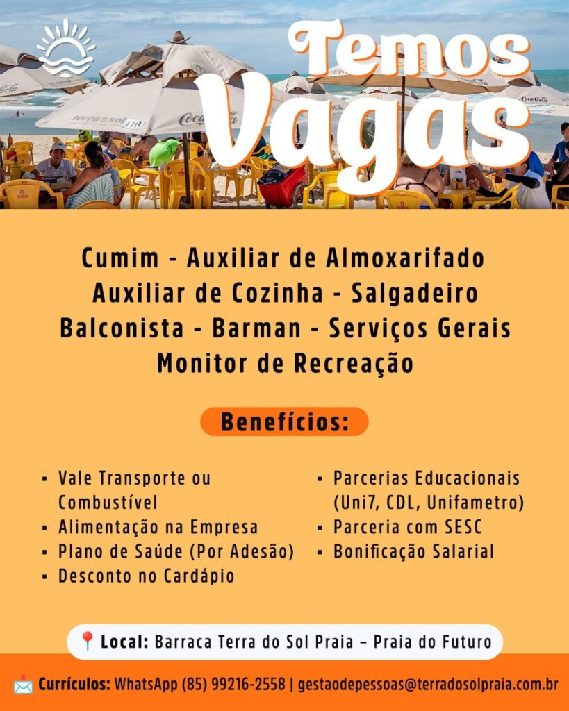 As vagas são divulgadas da mesma forma que recebemos. Não nos responsabilizamos pelas vagas, nem pelas informações fornecidas referente as mesmas, também não nos responsabilizamos pela idoneidade das empresas e instituições, apenas divulgamos as vagas que recebemos. Alertamos à buscar informações sobre as empresas que estão disponibilizando as vagas, através de contato por telefone ou e-mail divulgados nas mesmas, além de pesquisar na internet ou outros meios. Tome muito cuidado com locais (empresas ou instituições) que cobram taxas para garantir vagas ou para garantir uma colocação no mercado de trabalho. Esteja atento (a) a localização (endereço) da entrevista e do local de trabalho, se não conhecer ou achar que é um lugar isolado, vá com uma companhia ou não vá. Ter um emprego para garantir seu sustento e de sua família é importante, mas sua segurança e integridade também é, por isso, esteja atento. Se você é menor de idade vá acompanhado (a) de um (a) responsável.