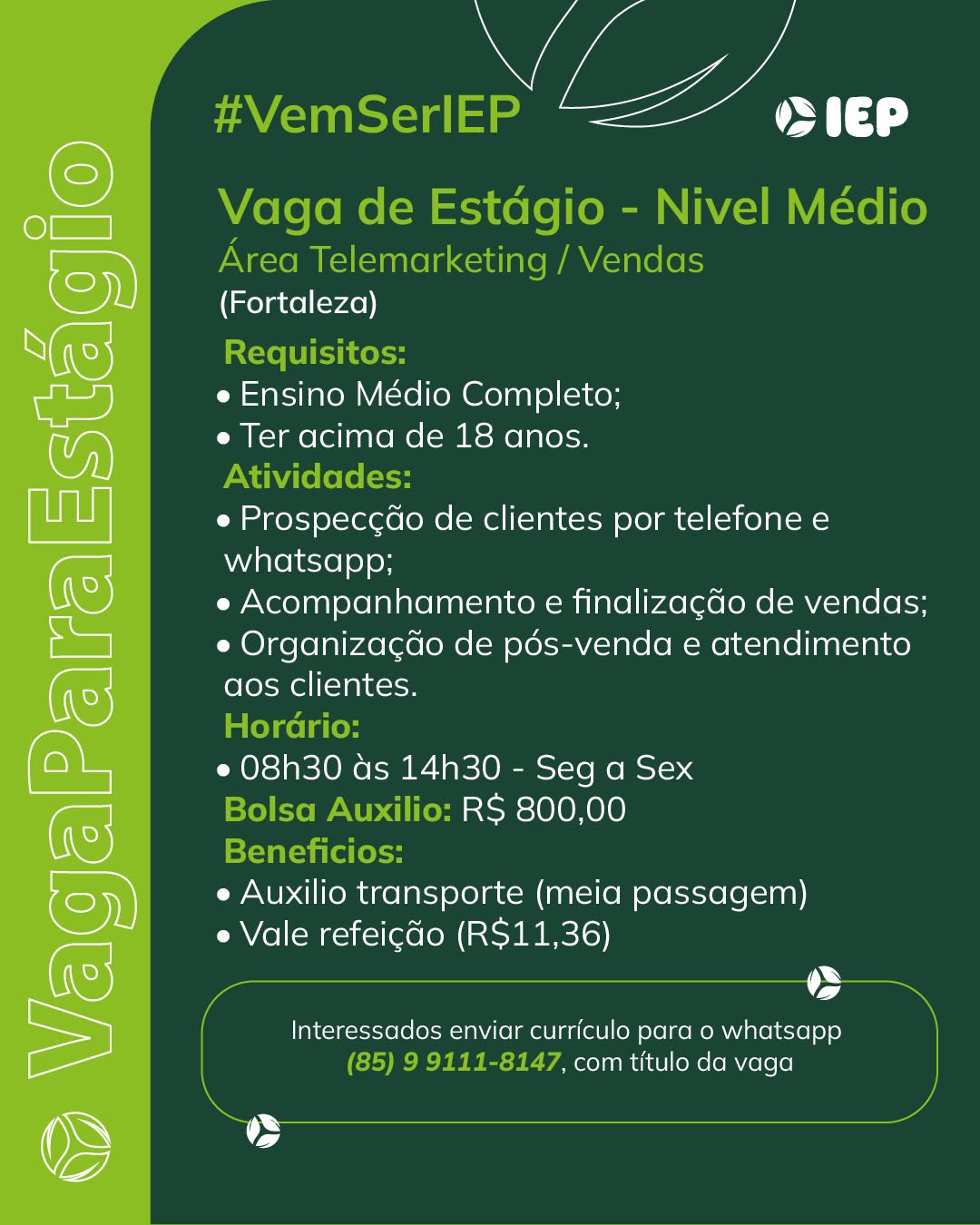 As vagas são divulgadas da mesma forma que recebemos. Não nos responsabilizamos pelas vagas, nem pelas informações fornecidas referente as mesmas, também não nos responsabilizamos pela idoneidade das empresas e instituições, apenas divulgamos as vagas que recebemos. Alertamos à buscar informações sobre as empresas que estão disponibilizando as vagas, através de contato por telefone ou e-mail divulgados nas mesmas, além de pesquisar na internet ou outros meios. Tome muito cuidado com locais (empresas ou instituições) que cobram taxas para garantir vagas ou para garantir uma colocação no mercado de trabalho. Esteja atento (a) a localização (endereço) da entrevista e do local de trabalho, se não conhecer ou achar que é um lugar isolado, vá com uma companhia ou não vá. Ter um emprego para garantir seu sustento e de sua família é importante, mas sua segurança e integridade também é, por isso, esteja atento. Se você é menor de idade vá acompanhado (a) de um (a) responsável.