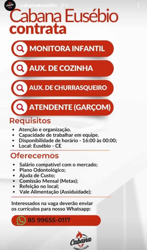 Monitora Infantil, Auxiliar de Cozinha, Auxiliar de Churrasqueiro, Atendente