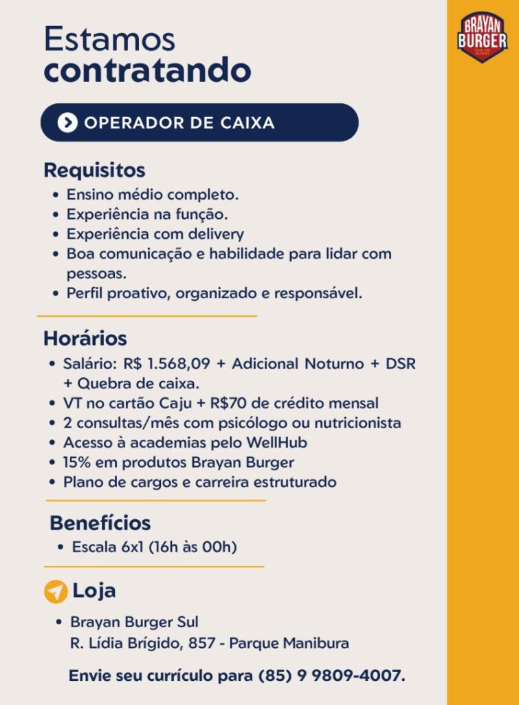 As vagas são divulgadas da mesma forma que recebemos. Não nos responsabilizamos pelas vagas, nem pelas informações fornecidas referente as mesmas, também não nos responsabilizamos pela idoneidade das empresas e instituições, apenas divulgamos as vagas que recebemos. Alertamos à buscar informações sobre as empresas que estão disponibilizando as vagas, através de contato por telefone ou e-mail divulgados nas mesmas, além de pesquisar na internet ou outros meios. Tome muito cuidado com locais (empresas ou instituições) que cobram taxas para garantir vagas ou para garantir uma colocação no mercado de trabalho. Esteja atento (a) a localização (endereço) da entrevista e do local de trabalho, se não conhecer ou achar que é um lugar isolado, vá com uma companhia ou não vá. Ter um emprego para garantir seu sustento e de sua família é importante, mas sua segurança e integridade também é, por isso, esteja atento. Se você é menor de idade vá acompanhado (a) de um (a) responsável.