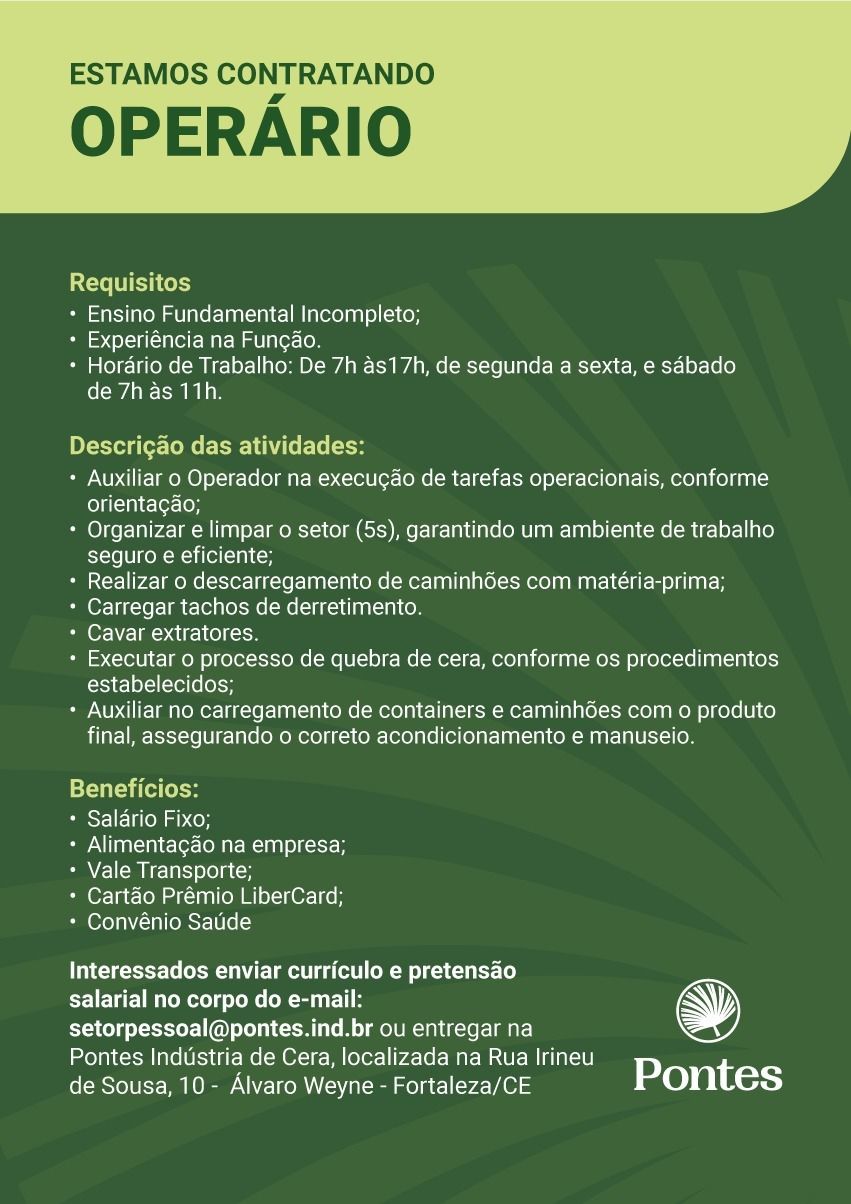 As vagas são divulgadas da mesma forma que recebemos. Não nos responsabilizamos pelas vagas, nem pelas informações fornecidas referente as mesmas, também não nos responsabilizamos pela idoneidade das empresas e instituições, apenas divulgamos as vagas que recebemos. Alertamos à buscar informações sobre as empresas que estão disponibilizando as vagas, através de contato por telefone ou e-mail divulgados nas mesmas, além de pesquisar na internet ou outros meios. Tome muito cuidado com locais (empresas ou instituições) que cobram taxas para garantir vagas ou para garantir uma colocação no mercado de trabalho. Esteja atento (a) a localização (endereço) da entrevista e do local de trabalho, se não conhecer ou achar que é um lugar isolado, vá com uma companhia ou não vá. Ter um emprego para garantir seu sustento e de sua família é importante, mas sua segurança e integridade também é, por isso, esteja atento. Se você é menor de idade vá acompanhado (a) de um (a) responsável.