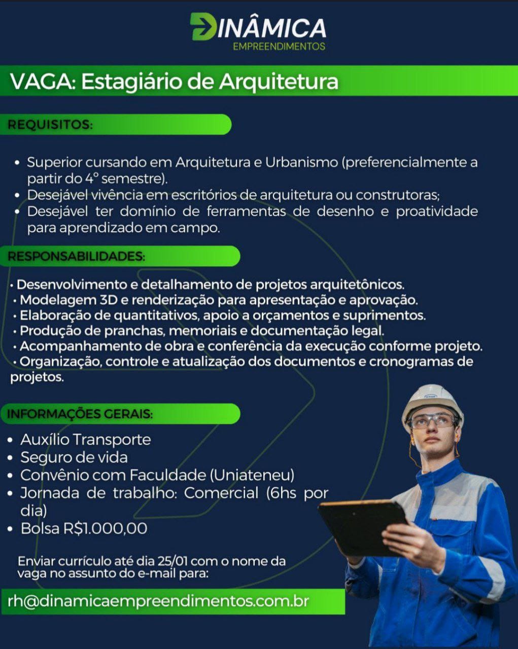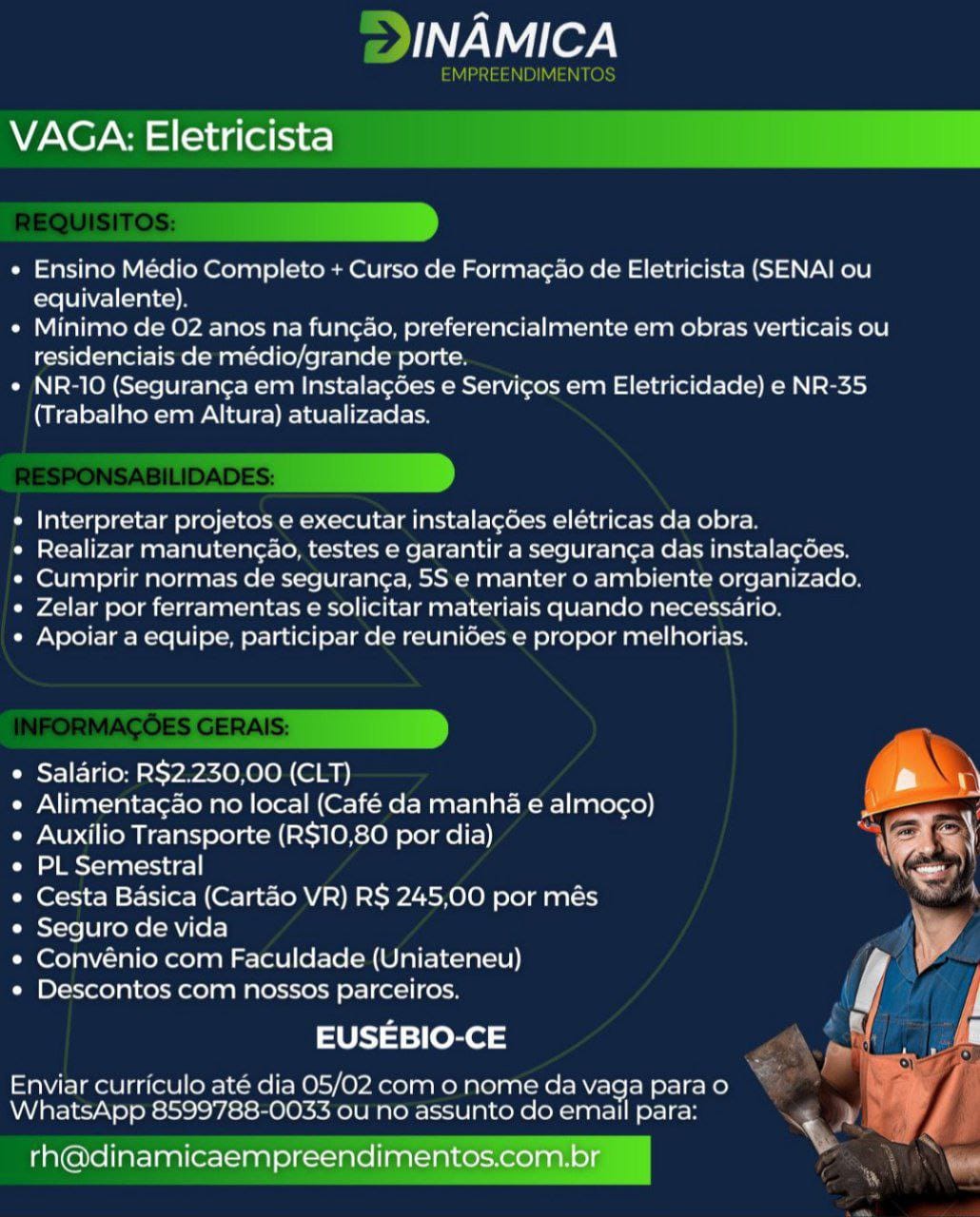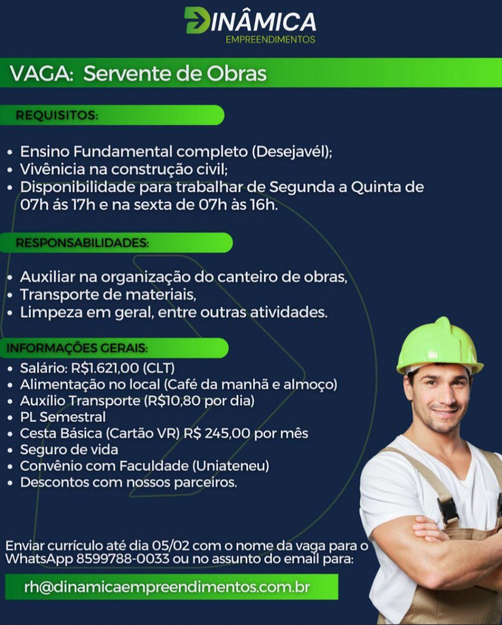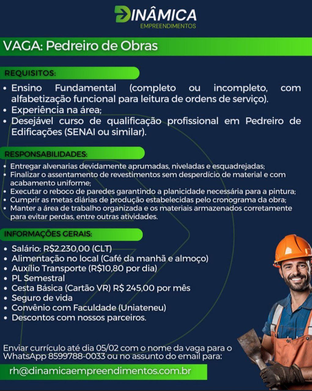 Pedreiro de Obras, Eletricista, Estágio em Arquitetura, Analista de Qualidade, Servente de Obras