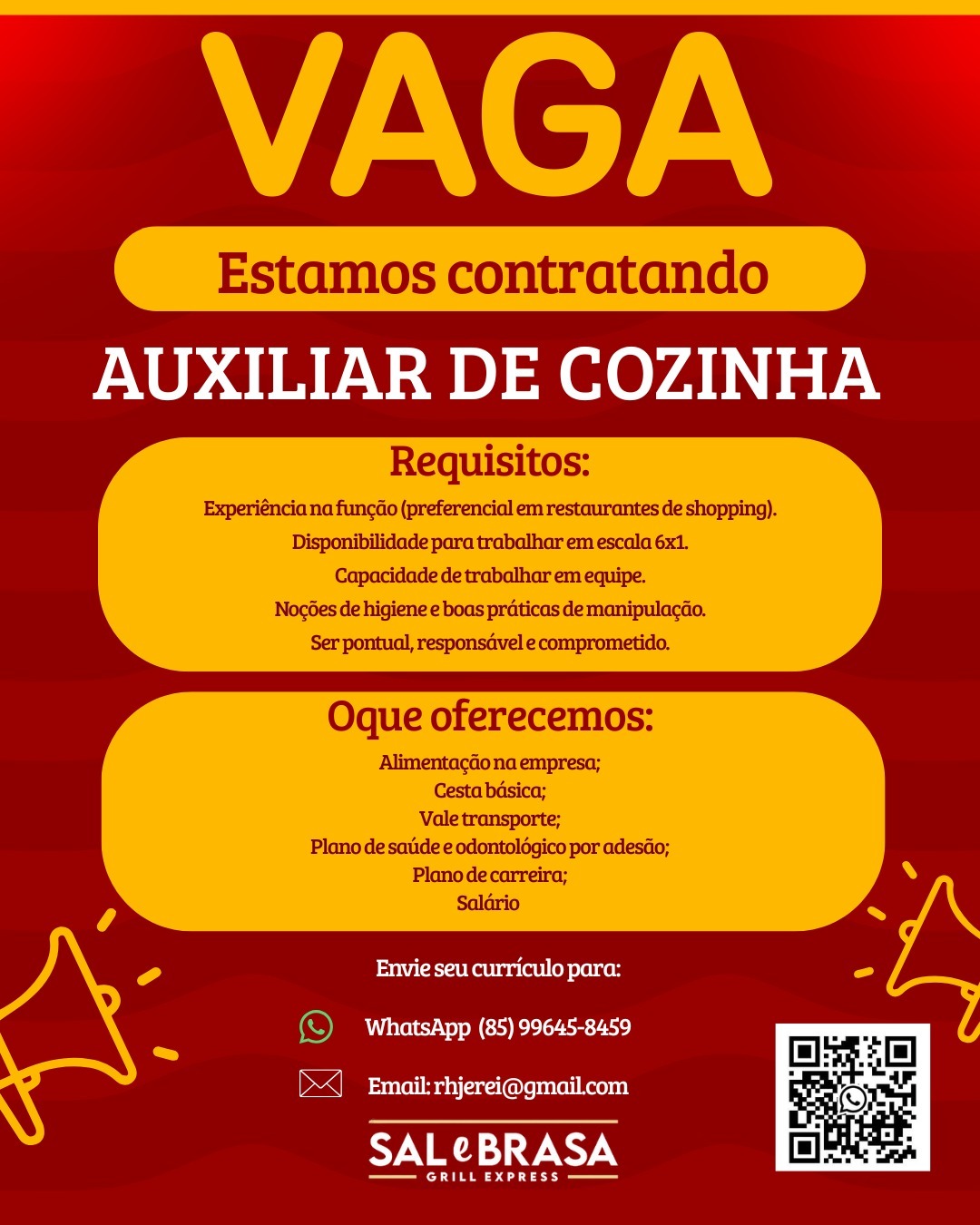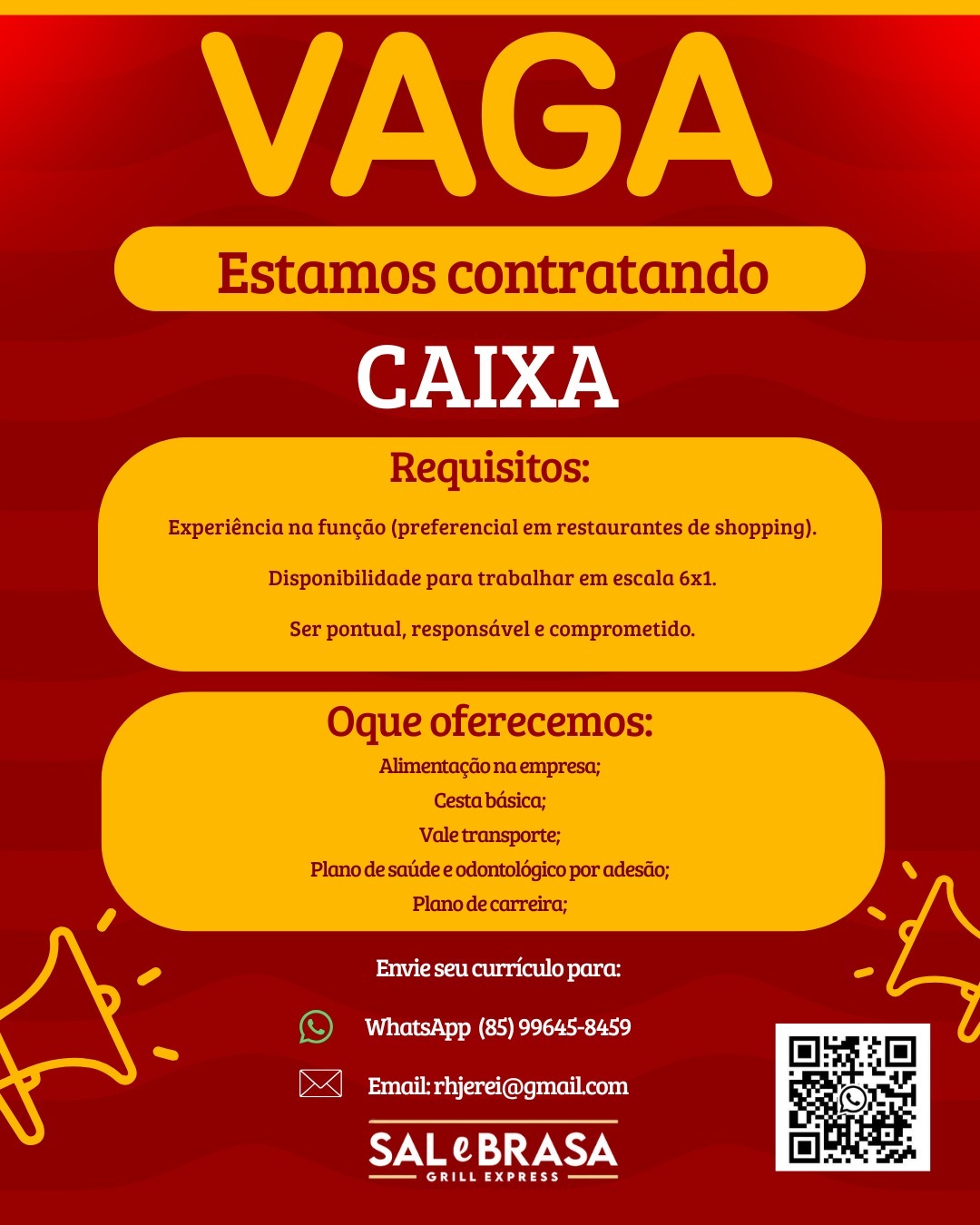 As vagas são divulgadas da mesma forma que recebemos. Não nos responsabilizamos pelas vagas, nem pelas informações fornecidas referente as mesmas, também não nos responsabilizamos pela idoneidade das empresas e instituições, apenas divulgamos as vagas que recebemos. Alertamos à buscar informações sobre as empresas que estão disponibilizando as vagas, através de contato por telefone ou e-mail divulgados nas mesmas, além de pesquisar na internet ou outros meios. Tome muito cuidado com locais (empresas ou instituições) que cobram taxas para garantir vagas ou para garantir uma colocação no mercado de trabalho. Esteja atento (a) a localização (endereço) da entrevista e do local de trabalho, se não conhecer ou achar que é um lugar isolado, vá com uma companhia ou não vá. Ter um emprego para garantir seu sustento e de sua família é importante, mas sua segurança e integridade também é, por isso, esteja atento. Se você é menor de idade vá acompanhado (a) de um (a) responsável.