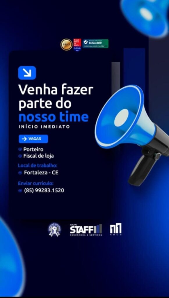As vagas são divulgadas da mesma forma que recebemos. Não nos responsabilizamos pelas vagas, nem pelas informações fornecidas referente as mesmas, também não nos responsabilizamos pela idoneidade das empresas e instituições, apenas divulgamos as vagas que recebemos. Alertamos à buscar informações sobre as empresas que estão disponibilizando as vagas, através de contato por telefone ou e-mail divulgados nas mesmas, além de pesquisar na internet ou outros meios. Tome muito cuidado com locais (empresas ou instituições) que cobram taxas para garantir vagas ou para garantir uma colocação no mercado de trabalho. Esteja atento (a) a localização (endereço) da entrevista e do local de trabalho, se não conhecer ou achar que é um lugar isolado, vá com uma companhia ou não vá. Ter um emprego para garantir seu sustento e de sua família é importante, mas sua segurança e integridade também é, por isso, esteja atento. Se você é menor de idade vá acompanhado (a) de um (a) responsável.